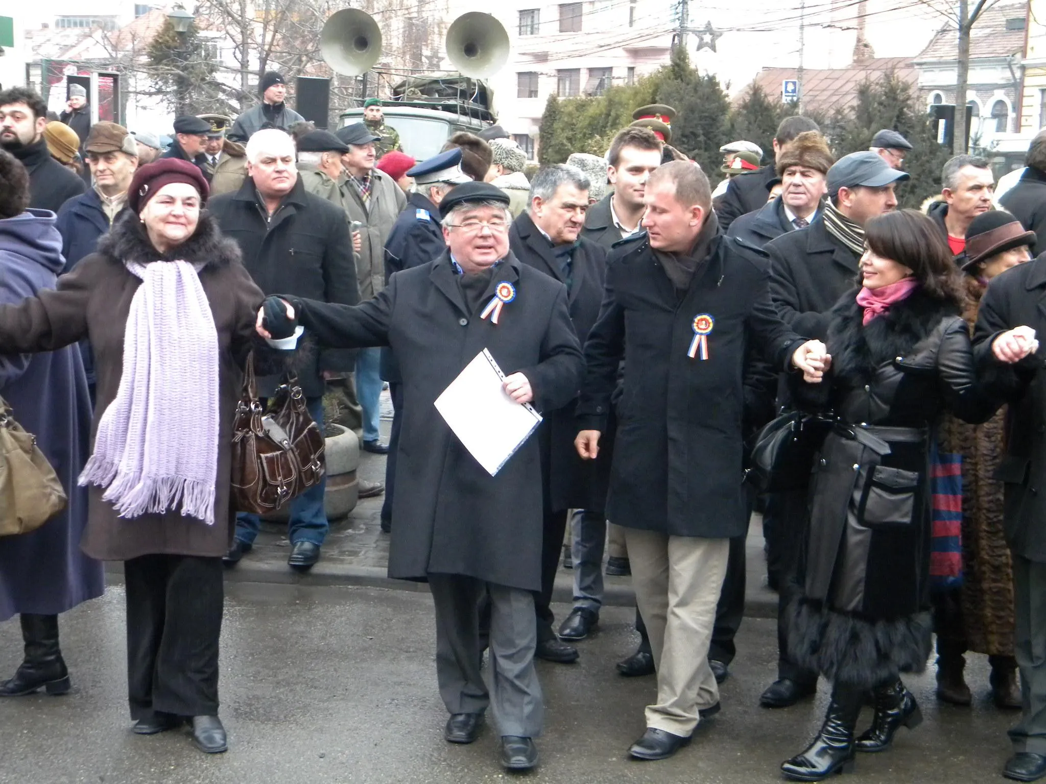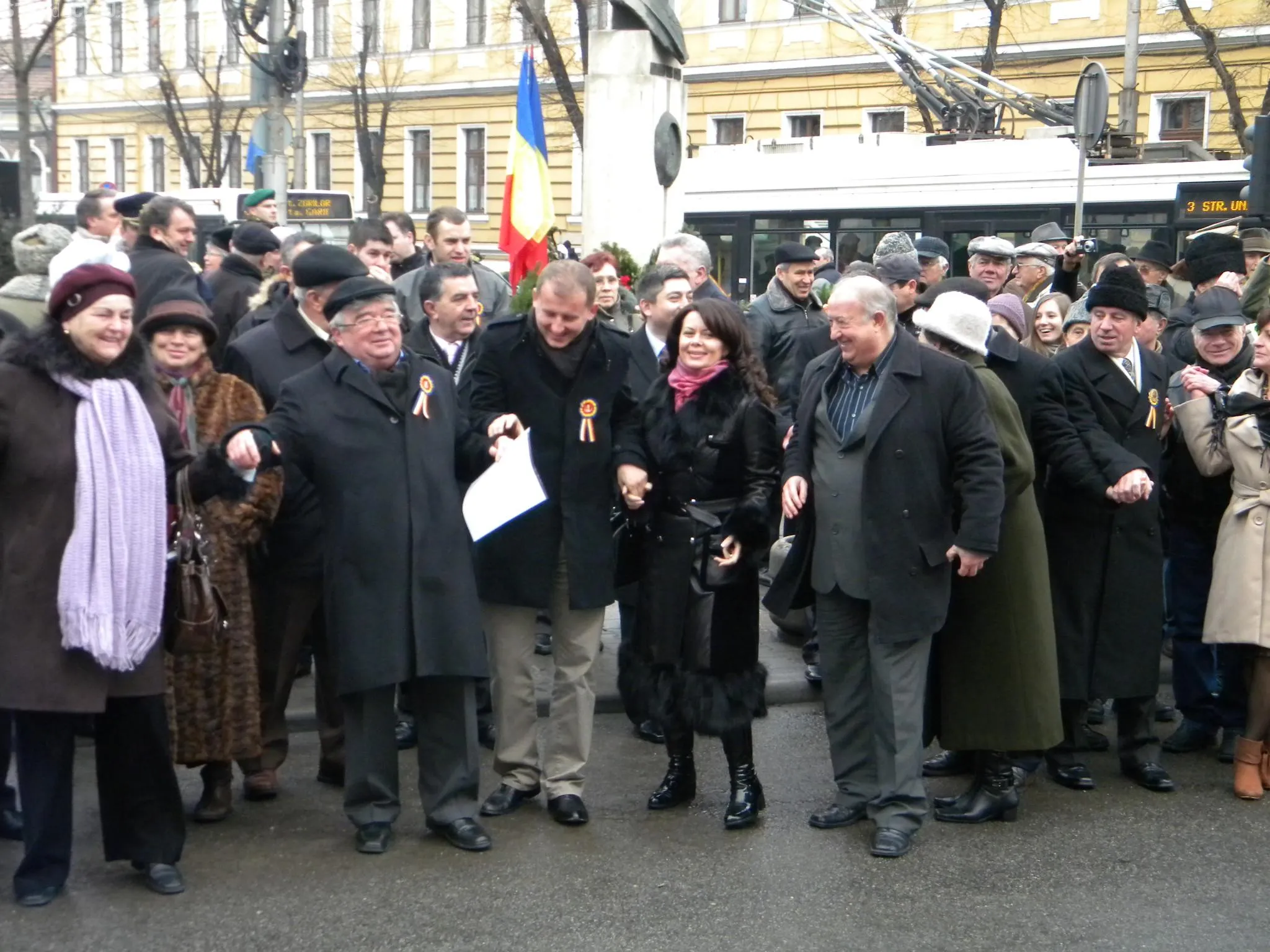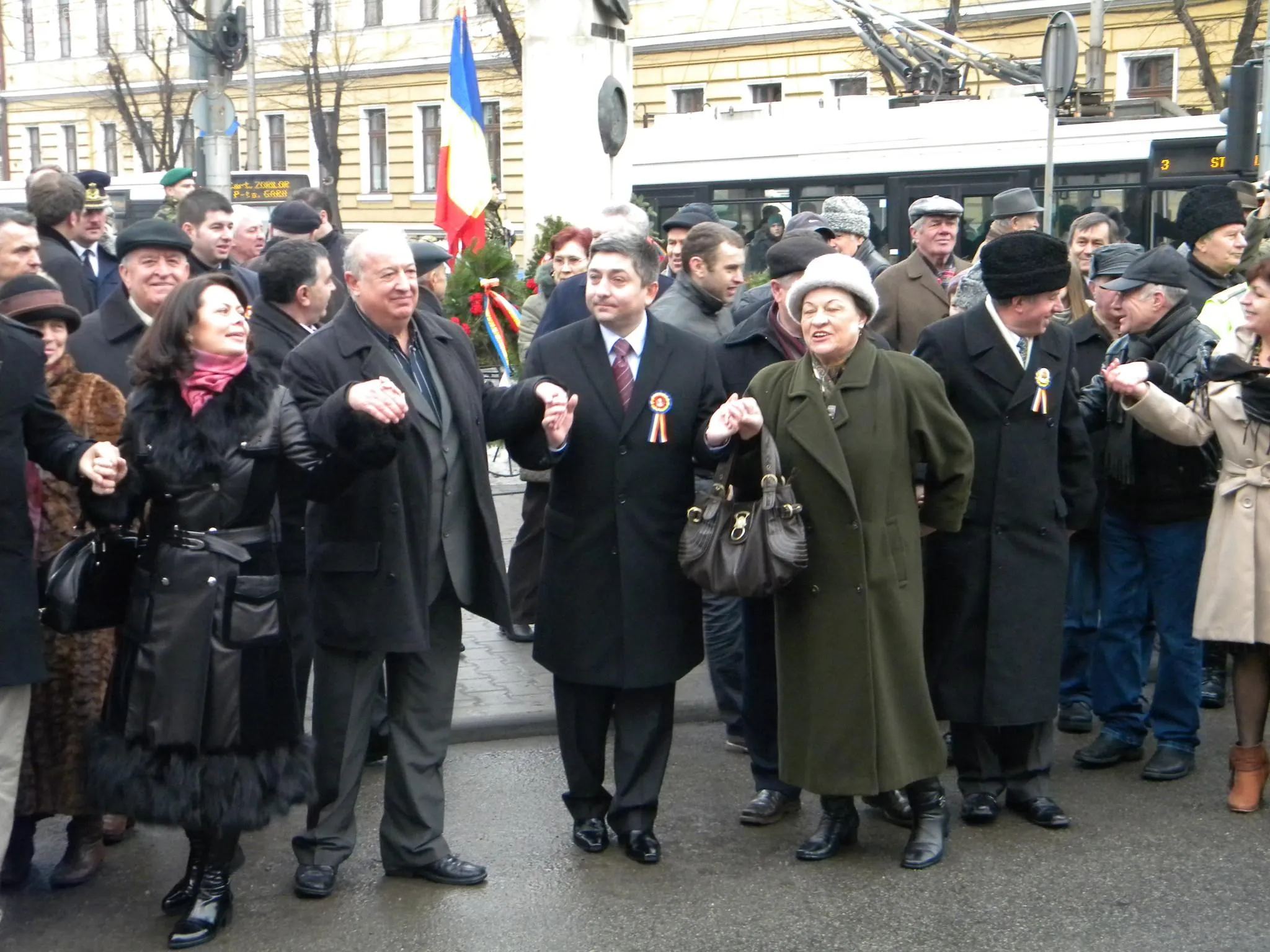 La finalul ceremoniei de depunere de coroane de flori la bustul domnitorului Alexandru Ioan Cuza, oficialii USL si cei ai PDL au dansat in fata Prefecturii.