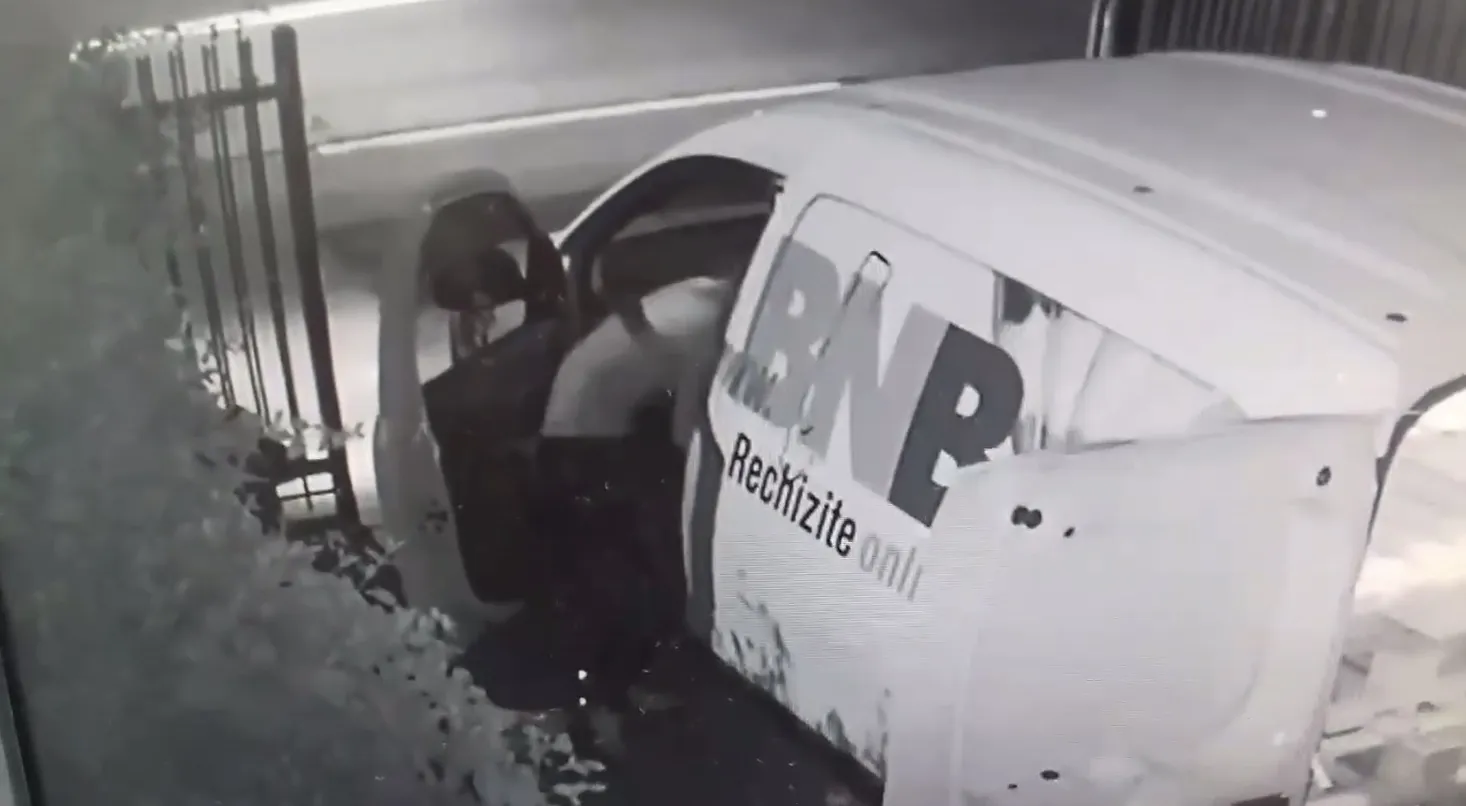 Bărbatul a fost filmat de camere cum profită de momentele scurte în care șoferul unei autoutilitare care descărca marfă în curtea unei societăți comerciale se întoarce cu spatele și apoi intră în mașină pentru a sustrage bunuri.