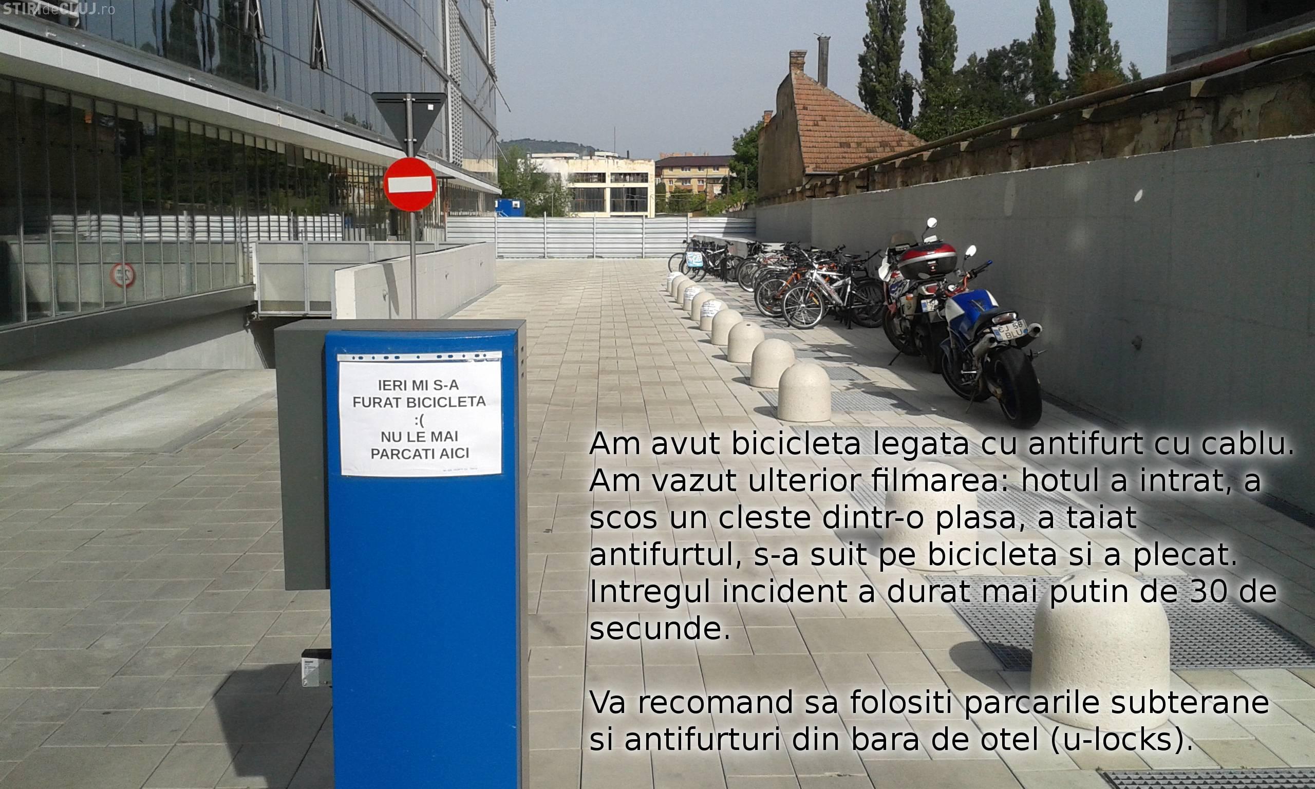 ”Am avut bicicleta legată cu antifurt cu cablu. Am văzut ulterior filmarea: hoțul a intrat, a scos un clește dintr-o plasă, a tăiat antifurtul, s-a suit pe bicicletă și a plecat. Întreg incidentul a durat mai puțin de 30 de secunde”, a scris păgubitul pe rețeua de socializare.
