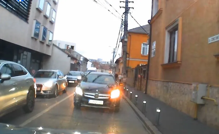 Un eveniment inedit s-a petrecut astăzi pe strada Constanța din Cluj-Napoca. Șoferul unui Mercedes nu a mai vrut să aștepte la rând și a decis că poate depăși coloana pe contrasens.