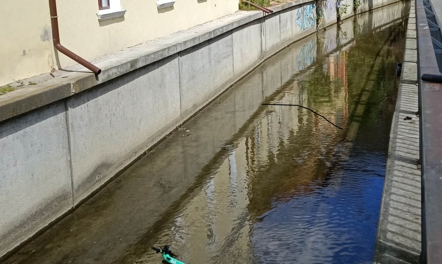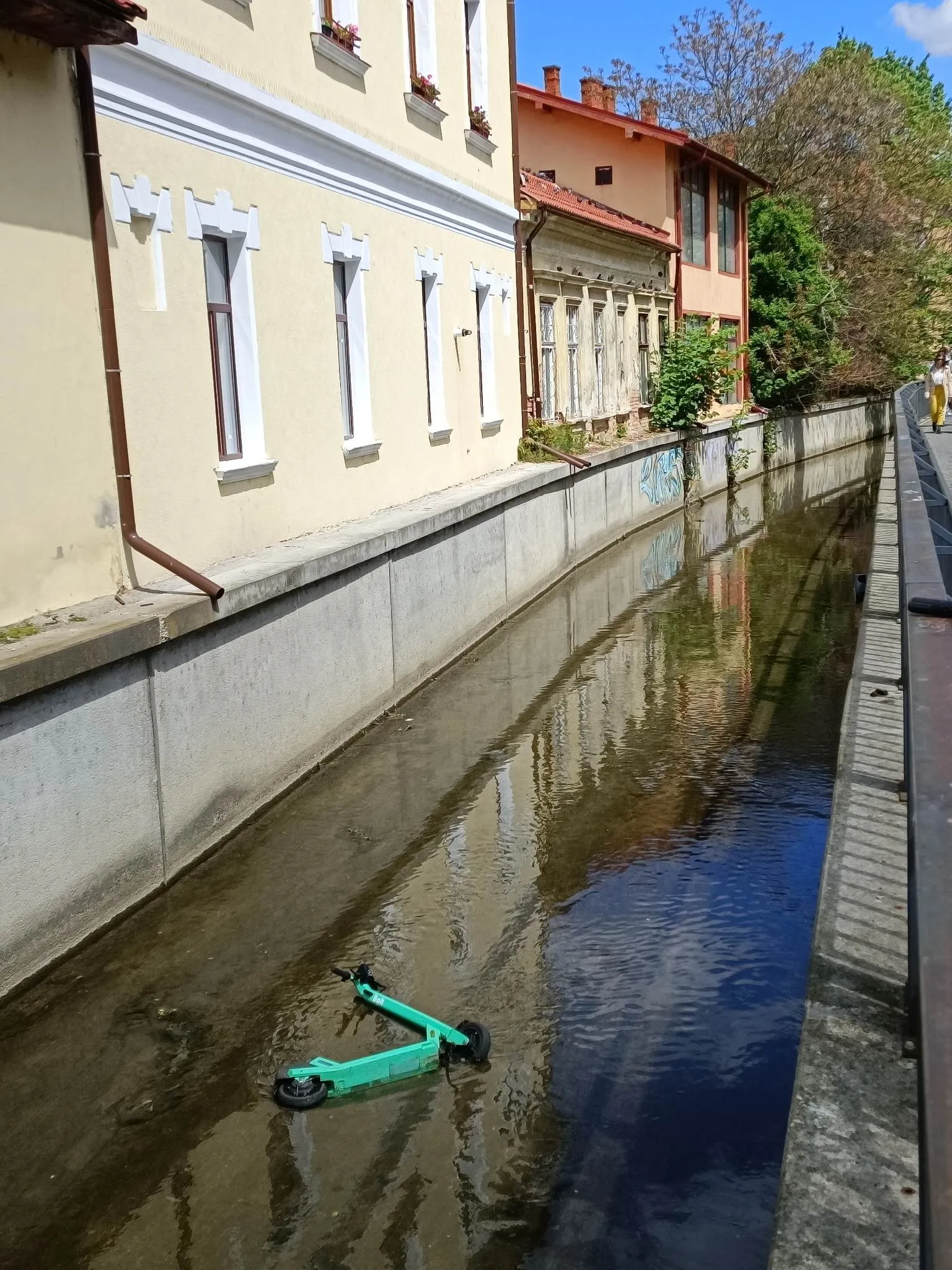 O trotinetă electrică a fost aruncată de cineva în Canalul Morii. Oamenii sunt exasperați de modul în care cei care le folosesc le abandonează practic pe spațiul public.