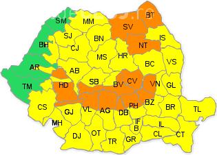 De asemenea, tot duminică, în intervalul orar11 – 18, a fost emis un avertisment de tip cod portocaliu, pentru mai multe județe din țară.