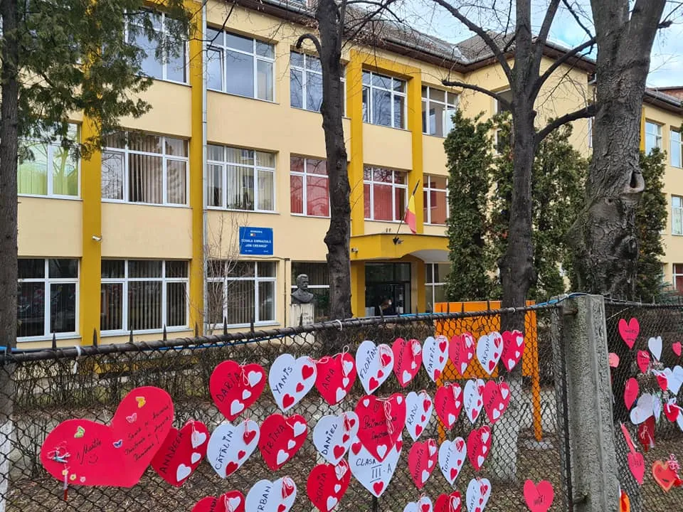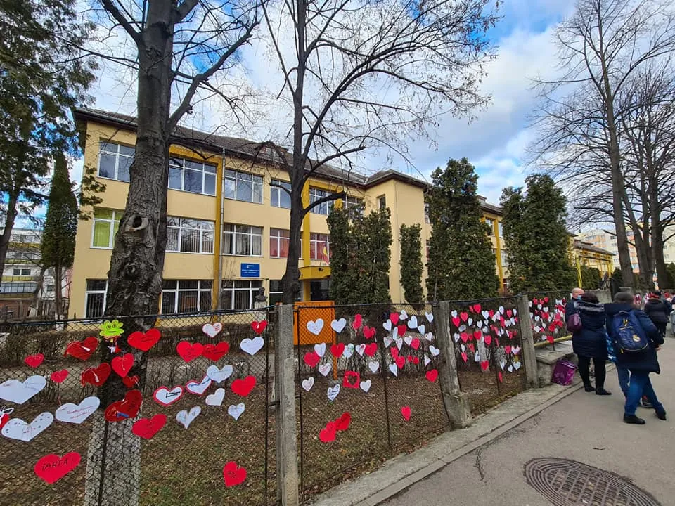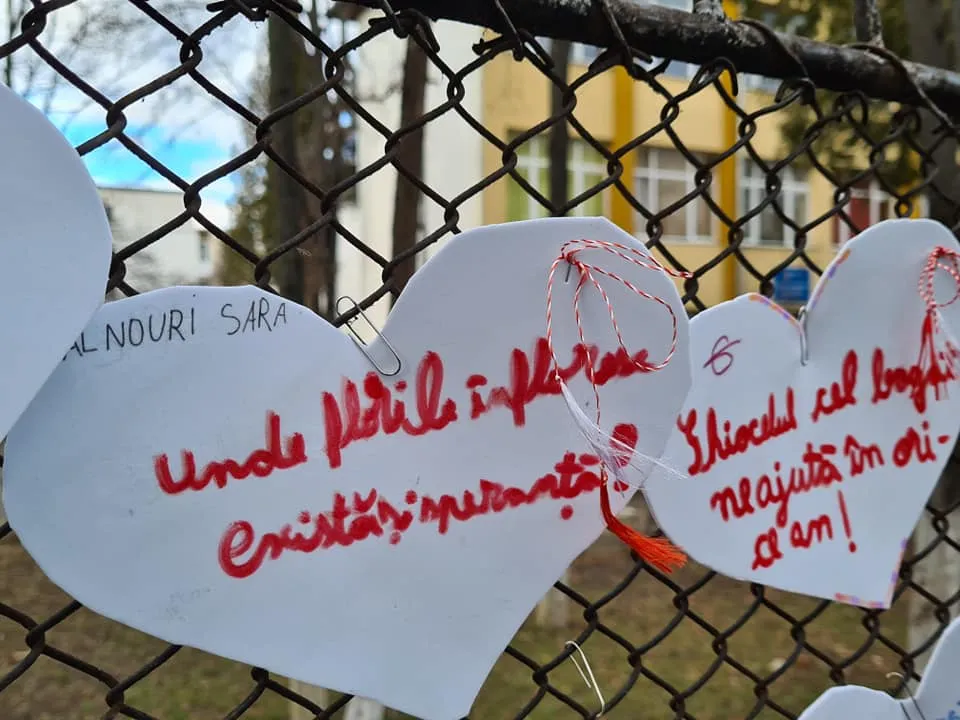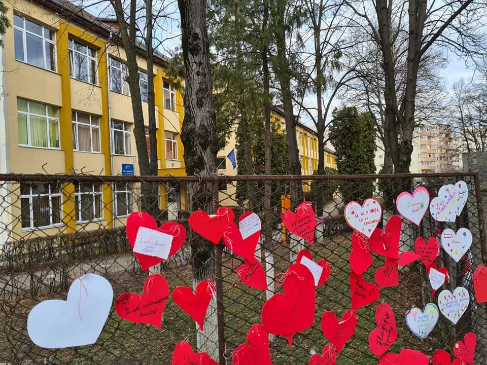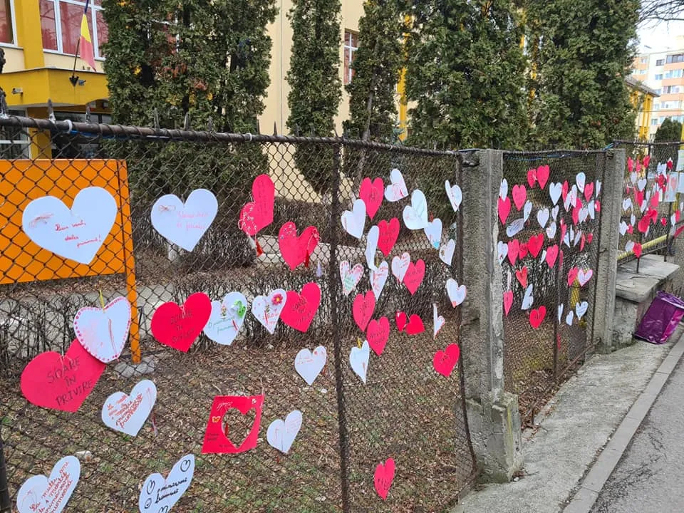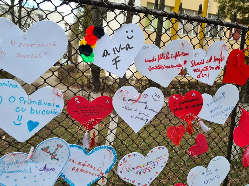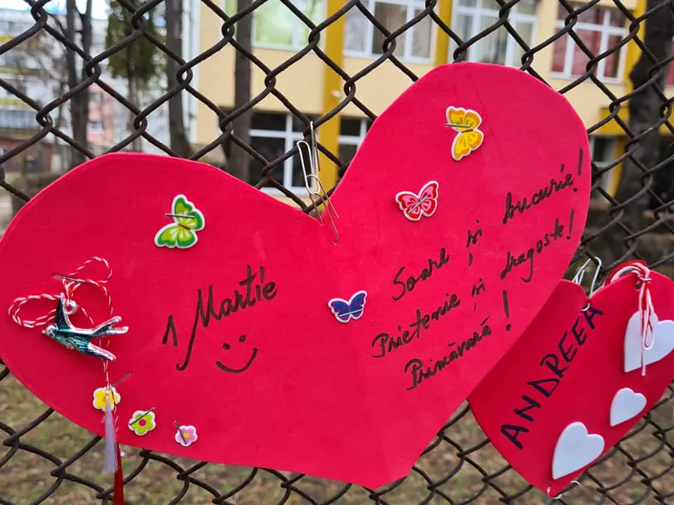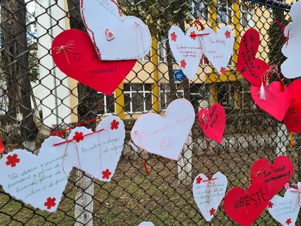 Elevii de la Scoala Gimnaziala "Ion Creangă" Cluj-Napoca au umplut gardurile unității de învățământ cu mărțișoare în formă de inimă.