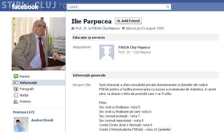 Ilie Parpucea, profesorul de la Facultatea de Stiinte Economice, care i-a cerut unei studente sa faca sex cu el pentru a o trece la examen s-a ales cu o pagina de Facebook.
