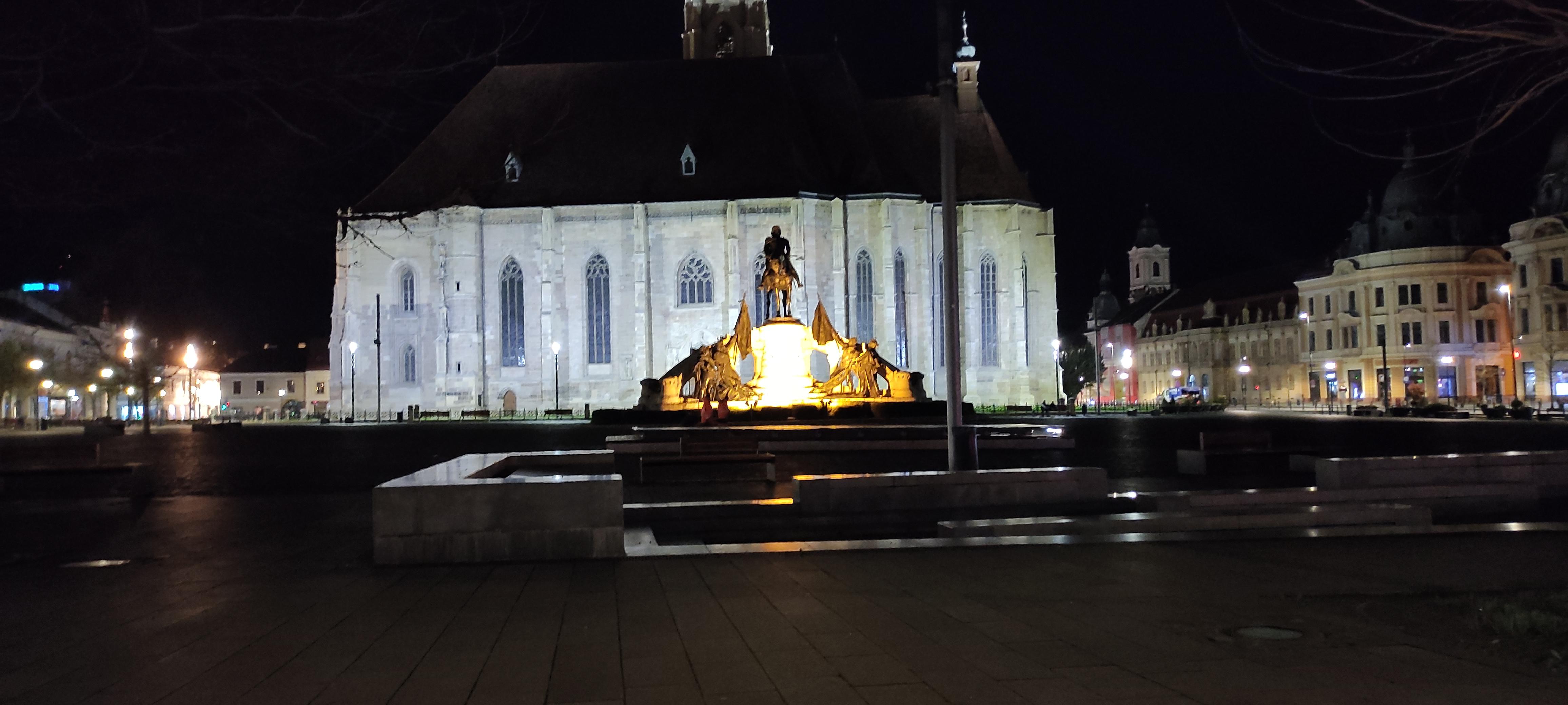 Sub statuia din Piața Unirii, care îl reprezintă pe Regele Matei Corvin, alături de alte 4 personalități istorice de o însemnătate deosebită, a fost montat, recent, un sistem de iluminat nou, care generează lumină galbenă, în contrast cu lumina albă care evidențiază Biserica Sfântul Mihail.