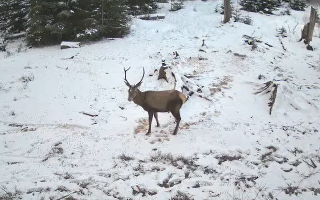 Un cerb superb a fost surprins într-un cadru de basm în Parcul Natural Apuseni, bucurându-se de o masă delicioasă oferită de specialiști.