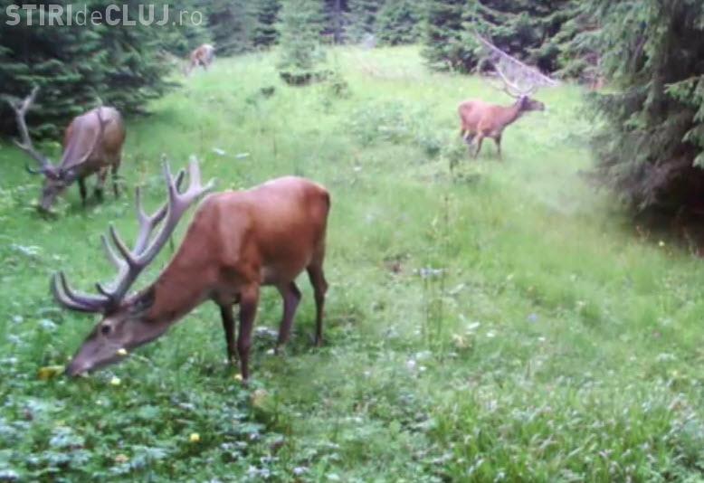 Imagini foarte frumoase cu patru cerbi care se hrănesc în liniște într-o pădure din Parcul Natural Apuseni au fost surprinse cu o cameră de monitorizare a faunei din parc, cu senzori de mișcare, amplasată de specialiștii Romsilva.