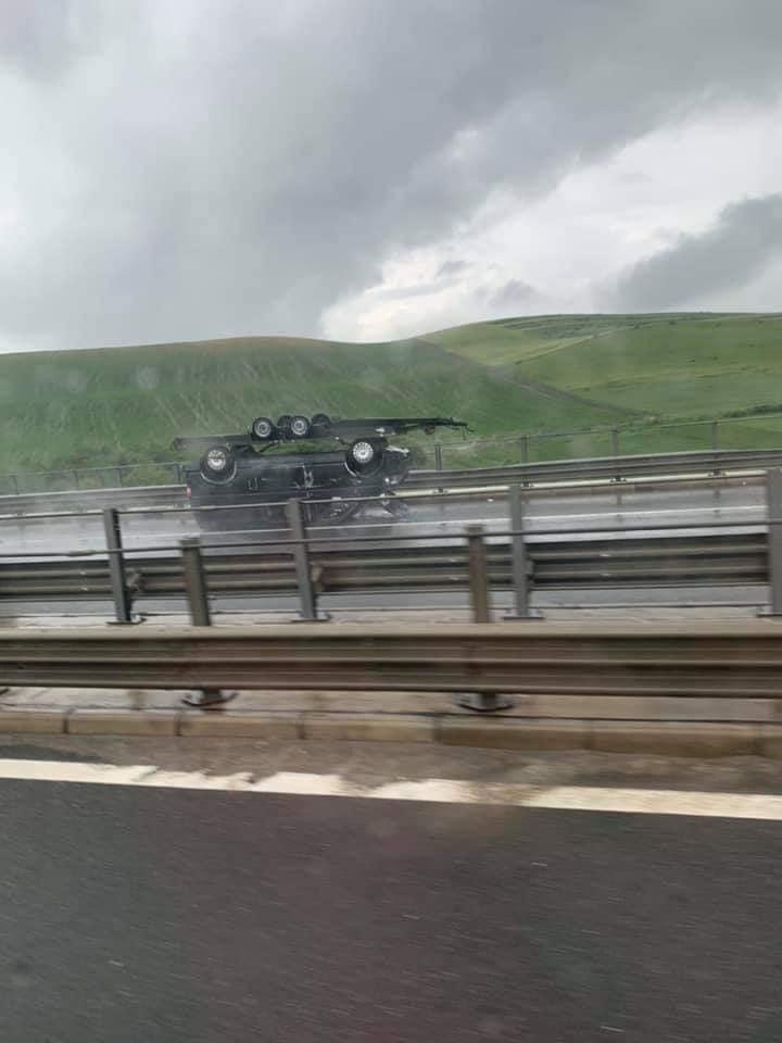 Imagini demne de cascadorii râsului! Platforma încărcată cu o mașină, răsturnată complet pe autostrada A3 FOTO