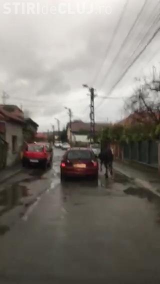 Un cal era alergat pe stradă, după o mașină, în Gherla. Proprietarul era în dreapta șoferului și ținea animalul de căpăstru.