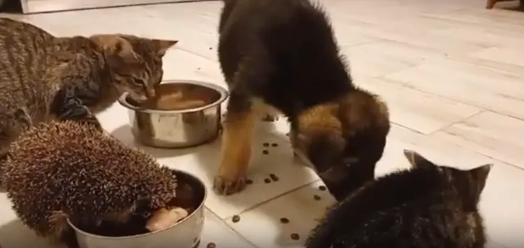 Un arici, doi căței și o pisică au împărțit frățește masa de seară.