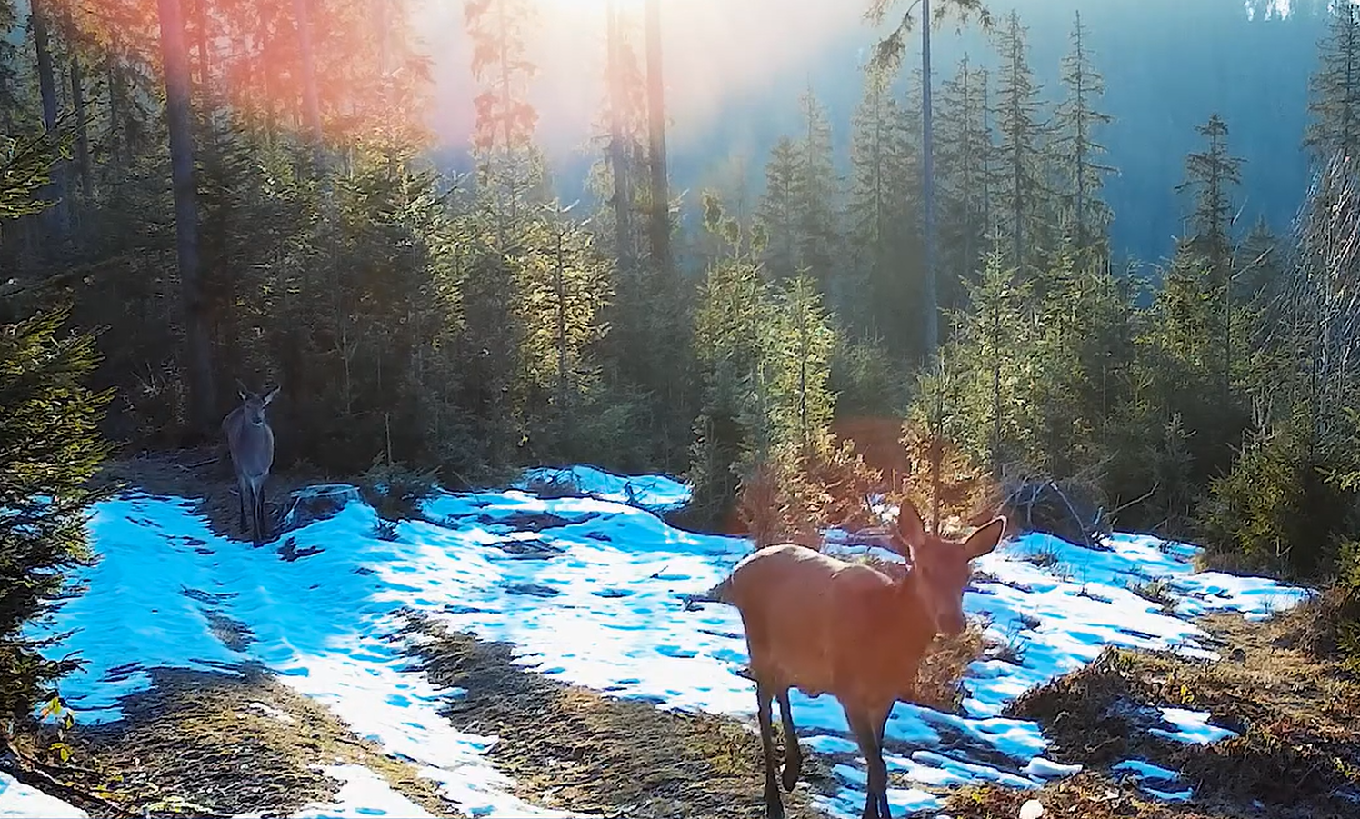Imagini magice! Două ciute superbe, surprinse la „plimbare” prin Apuseni: „Iarna începe să-și piardă din stăpânire” VIDEO
