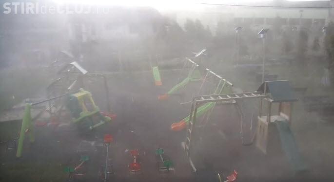 În imagini se vede o intersecție, unde mașinile au fost avariate de bucăți din acoperișurile luate de vântul puternic, dar și un loc de joacă, de unde copiii și câteva mămici a fugit cu câteva secunde înainte de începerea urgiei.