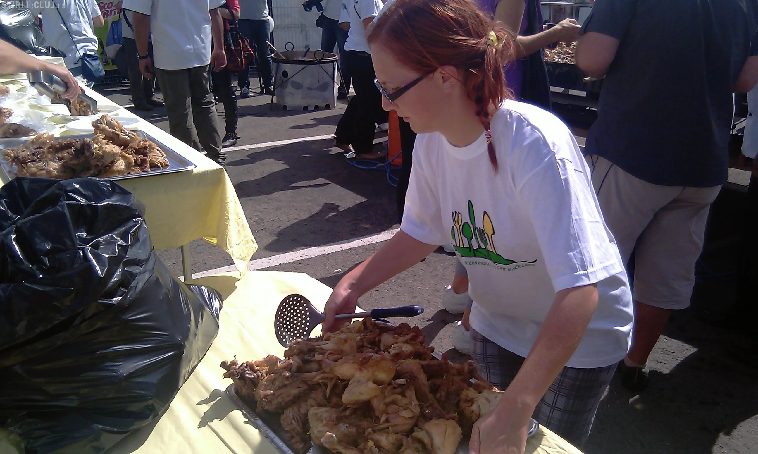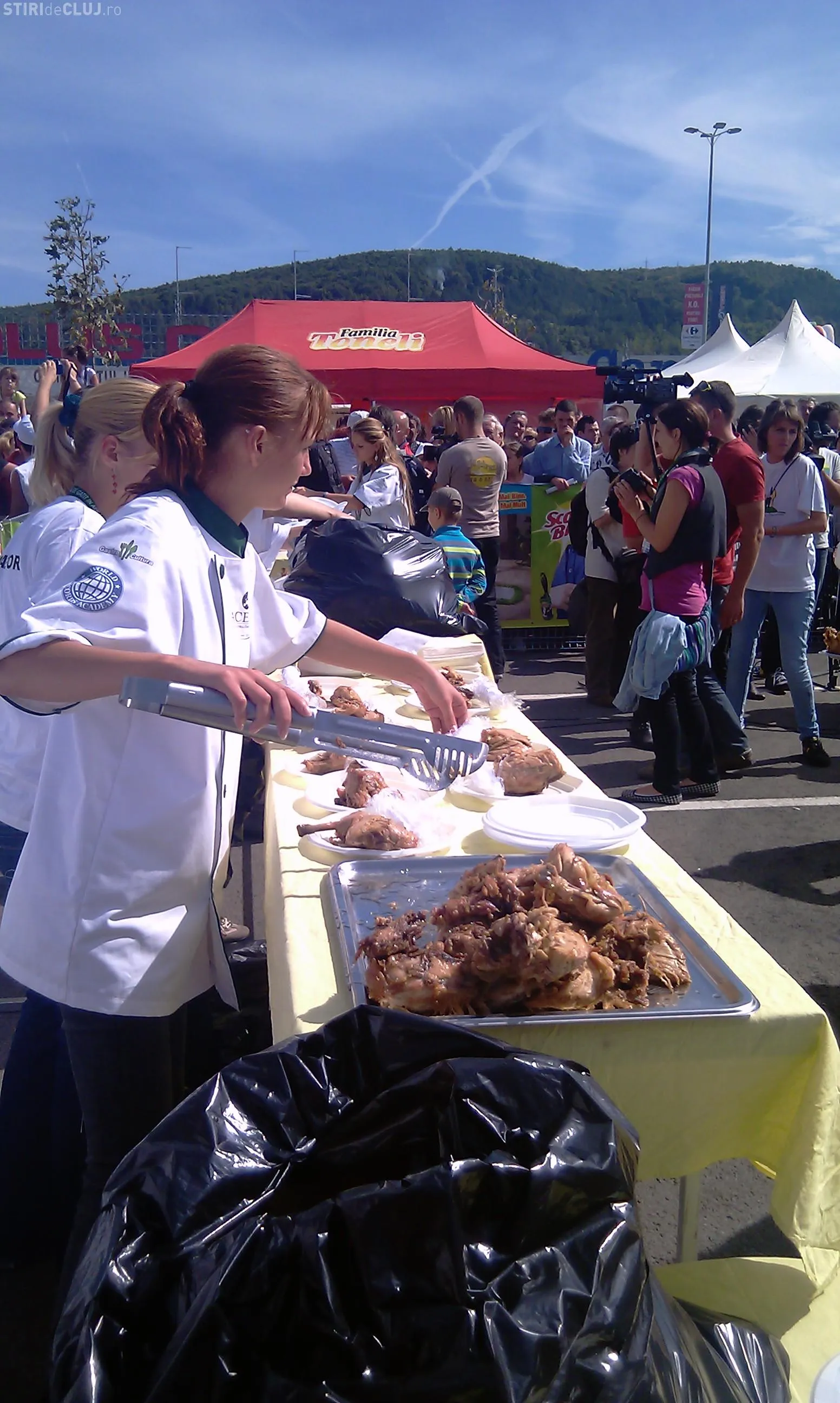 Clujenii au fost la un pas de a se calca in picioare la Campionatul International de Gatit in Aer Liber. Aproape 300 de persoane s-au inghesuit sa prinda o portie din cei 210 pui gatiti, in tentativa de doborare a recordului mondial.