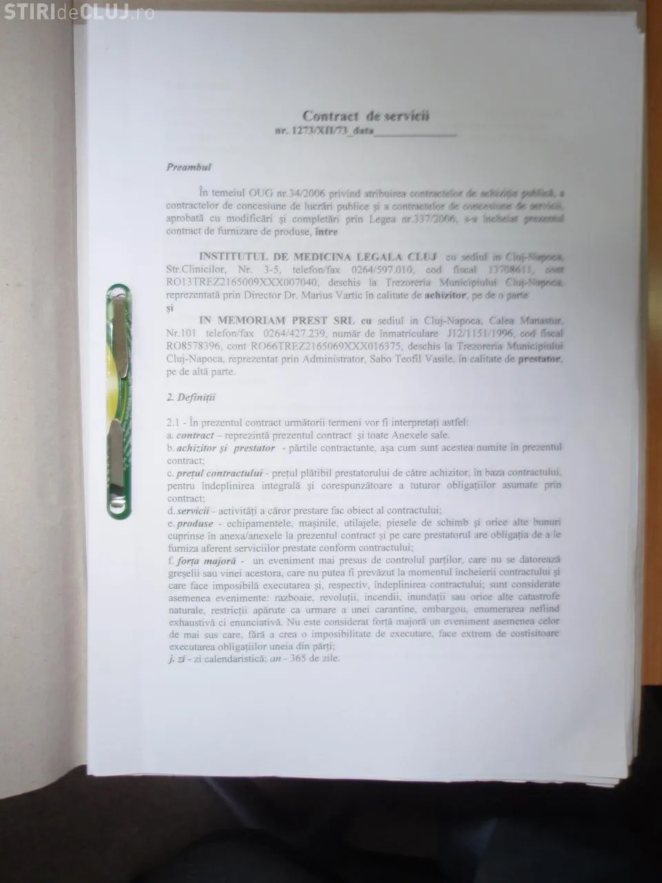 Institutul de Medicina Legala Cluj (IML) a incheiat in 1999 un contract de prestari servicii cu societatea In Memoriam Prest SRL, administrata de Sabo Teofil Vasile.