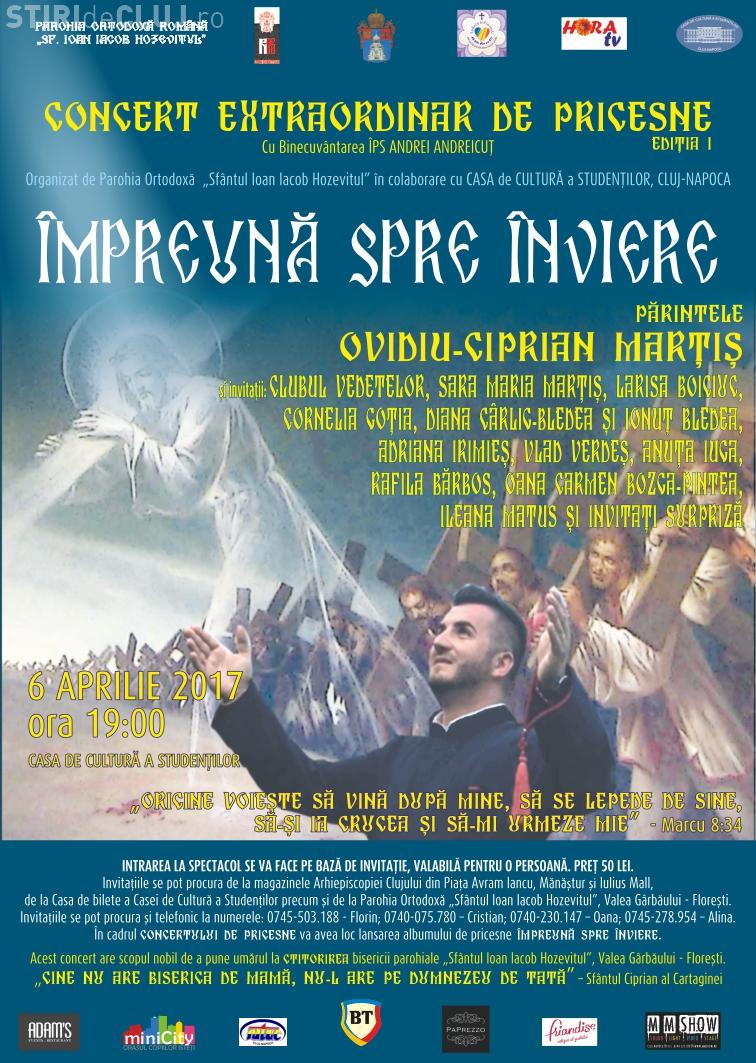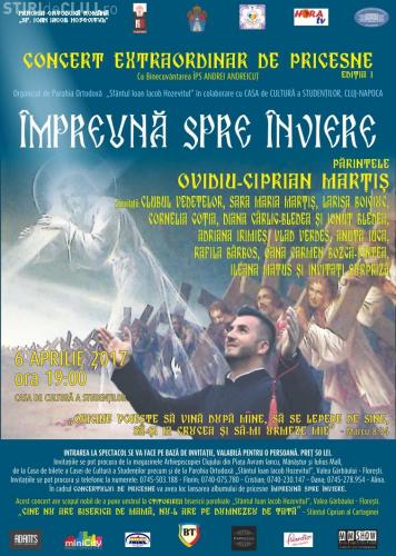 Parohia Ortodoxã ”Sfântul Ioan Iacob Hozevitul” din Florești îi invită pe clujeni la un Concert Extraordinar de PRICESNE, intitulat: "ÎMPREUNĂ SPRE ÎNVIERE"!, care va avea loc la Casa de Cultură a Studenților din Cluj-Napoca, în data de 6 aprilie 2017, de la ora 19:00.