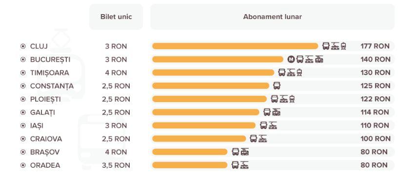 Dintre cele 10 orașe, cel mai scump bilet simplu se găsește în Timișoara și Brașov și costă 4 lei. Pe de altă parte, cetățenii din Constanța, Iași, Ploiești și Galați se pot bucura de cele mai ieftine bilete simple – 2,5 lei. Când vine vorba de abonamentele lunare, cetățenii din Cluj și București trebuie să plătească cel mai mare preț – 177 lei, respectiv 140 lei. Cel mai ieftin abonament lunar poate fi găsit în Oradea și Brașov (80 lei).