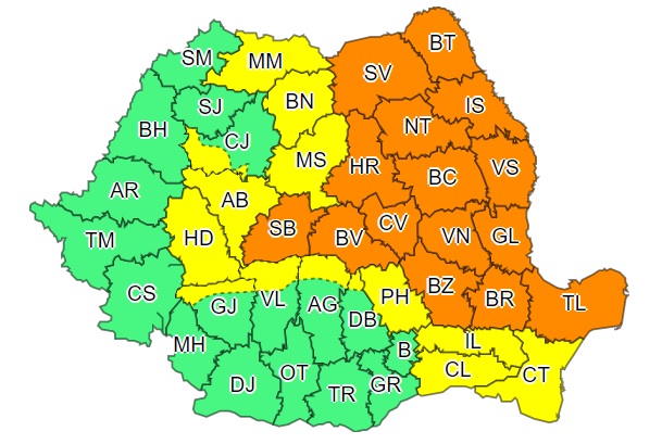 Meteorologii de la ANM au emis o nouă serie de avertismente de vreme rea, care afectează aproape toată țara.