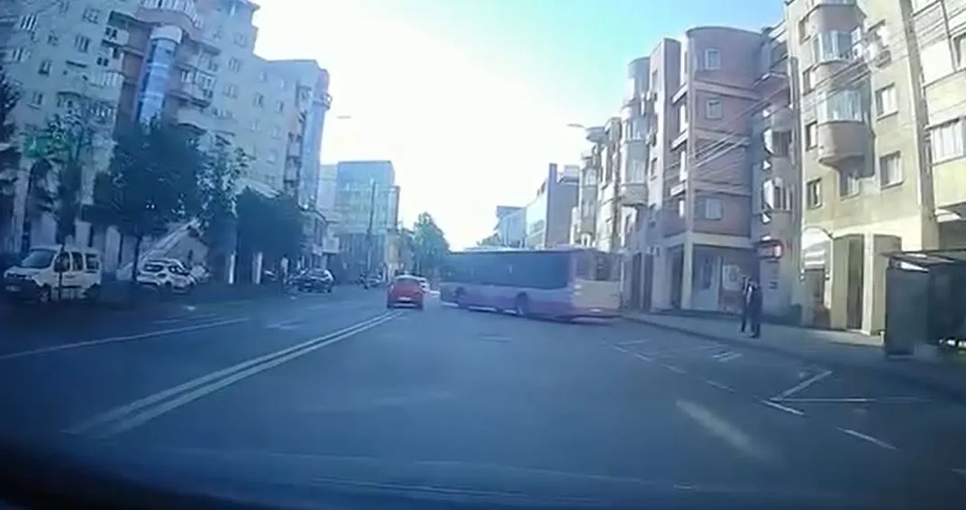 Șoferul autobuzului a continuat deplasarea și i-a tăiat calea. Conducătorul autoturismului, în loc să frâneze, a luat o decizie riscantă. A accelerat, a depășit linia dublă continuă, intrând pe contrasens și aproape lovind un taximetrist care circula regulamentar.