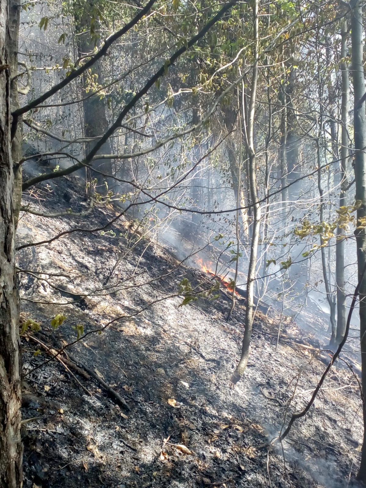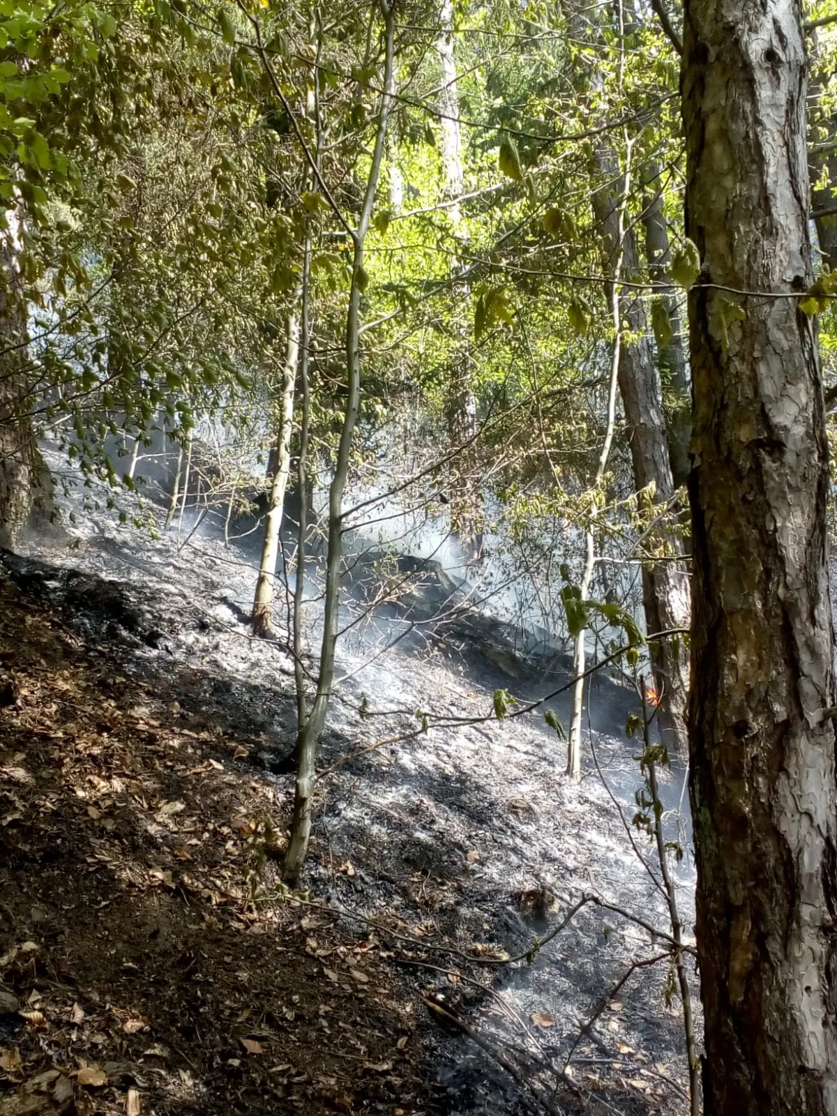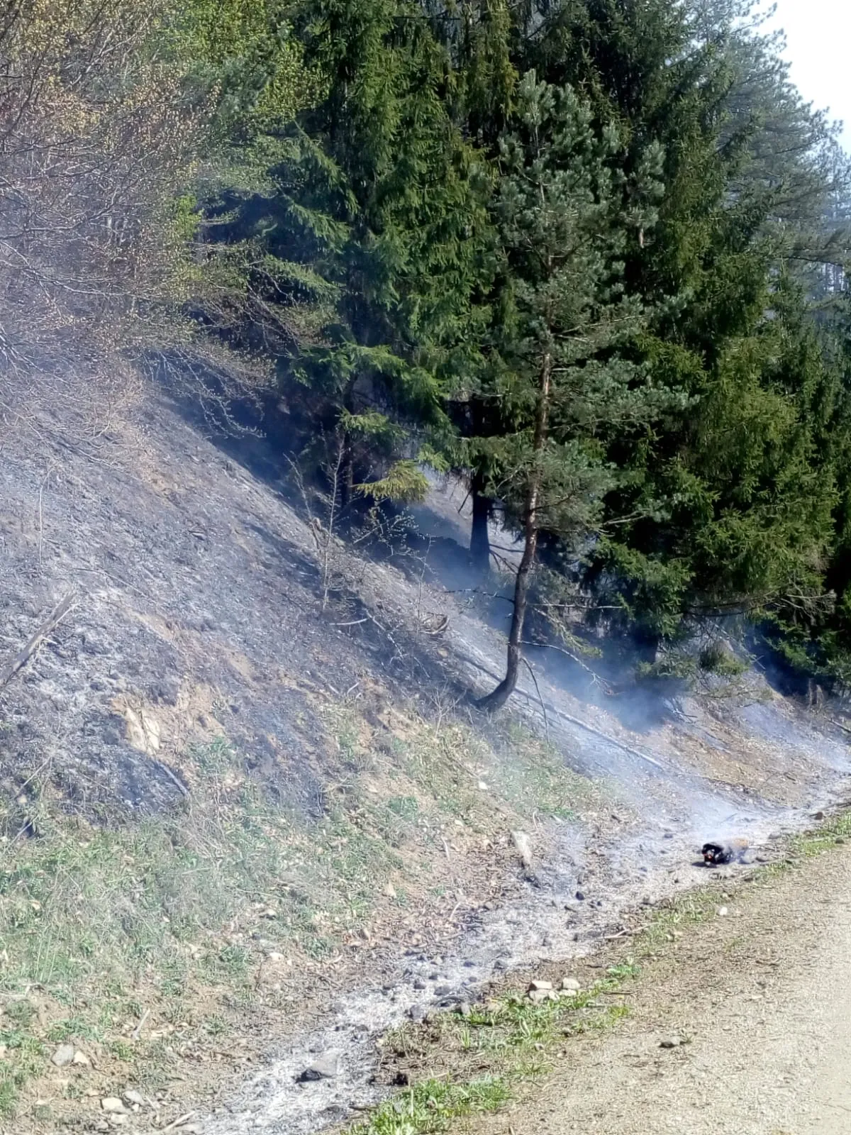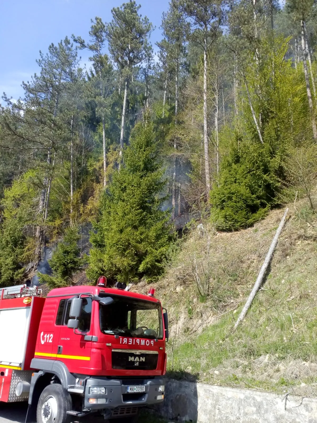 Primele focare, care se manifestau la circa 50 m de casele de locuit, au fost lichidate și se lucrează pentru a stinge celelalte focare pe o pantă foarte abruptă și cu vânt intens, care favorizează propagarea flăcărilor.