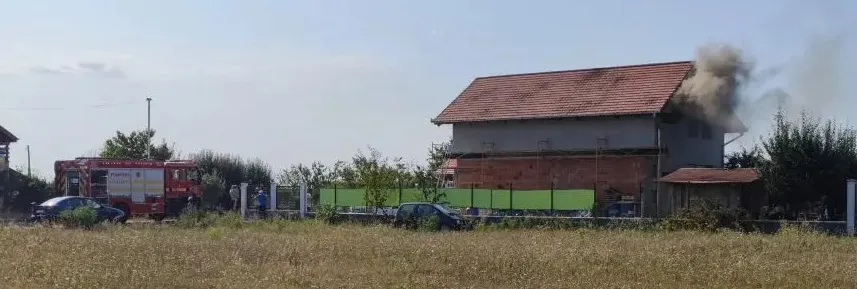 În aceste momente pompierii acționează pentru stingerea incendiului care se petrece la mansarda casei.
