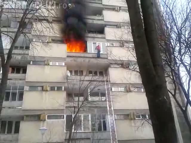 Un barbat a reusit sa se salveze si a iesit din apartamentul in flacari, ramanand suspendat in afara balconului la nici un metru de flacarile puternice. Pompierii au sosit in zona si ridicat scarile de la autospeciale si l-au coborat pe barbat.