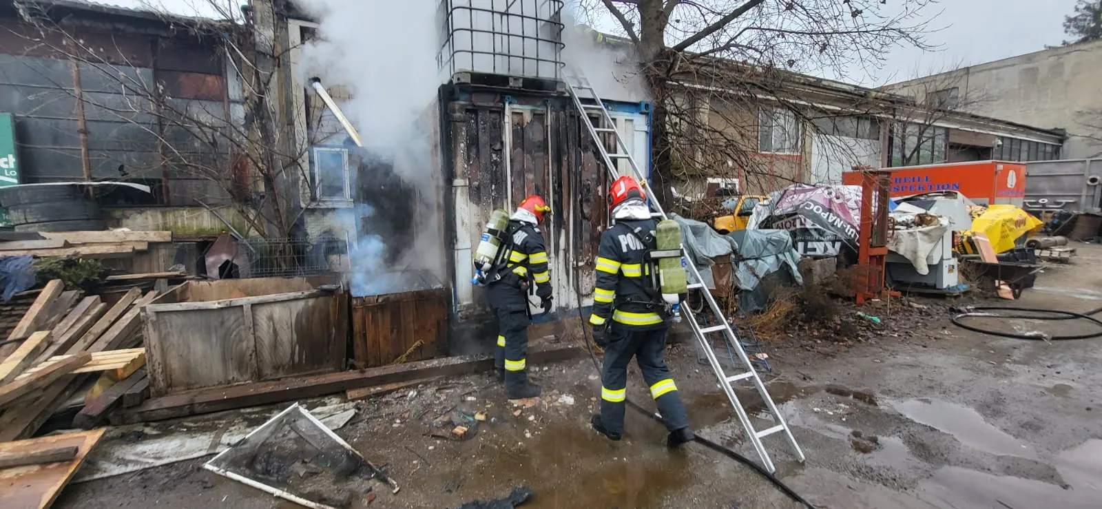 „Pompierii intervin pentru a stinge un incendiu care a cuprins un container unde sunt depozitate mai multe cauciucuri.
