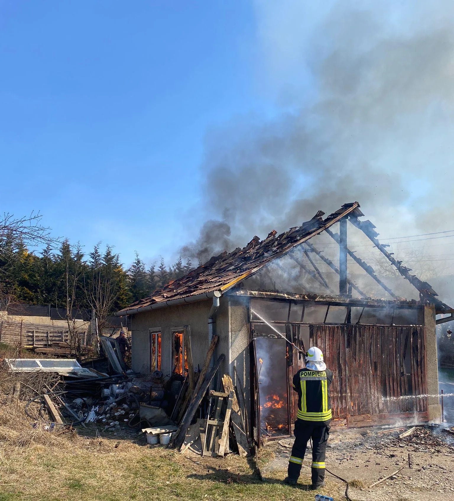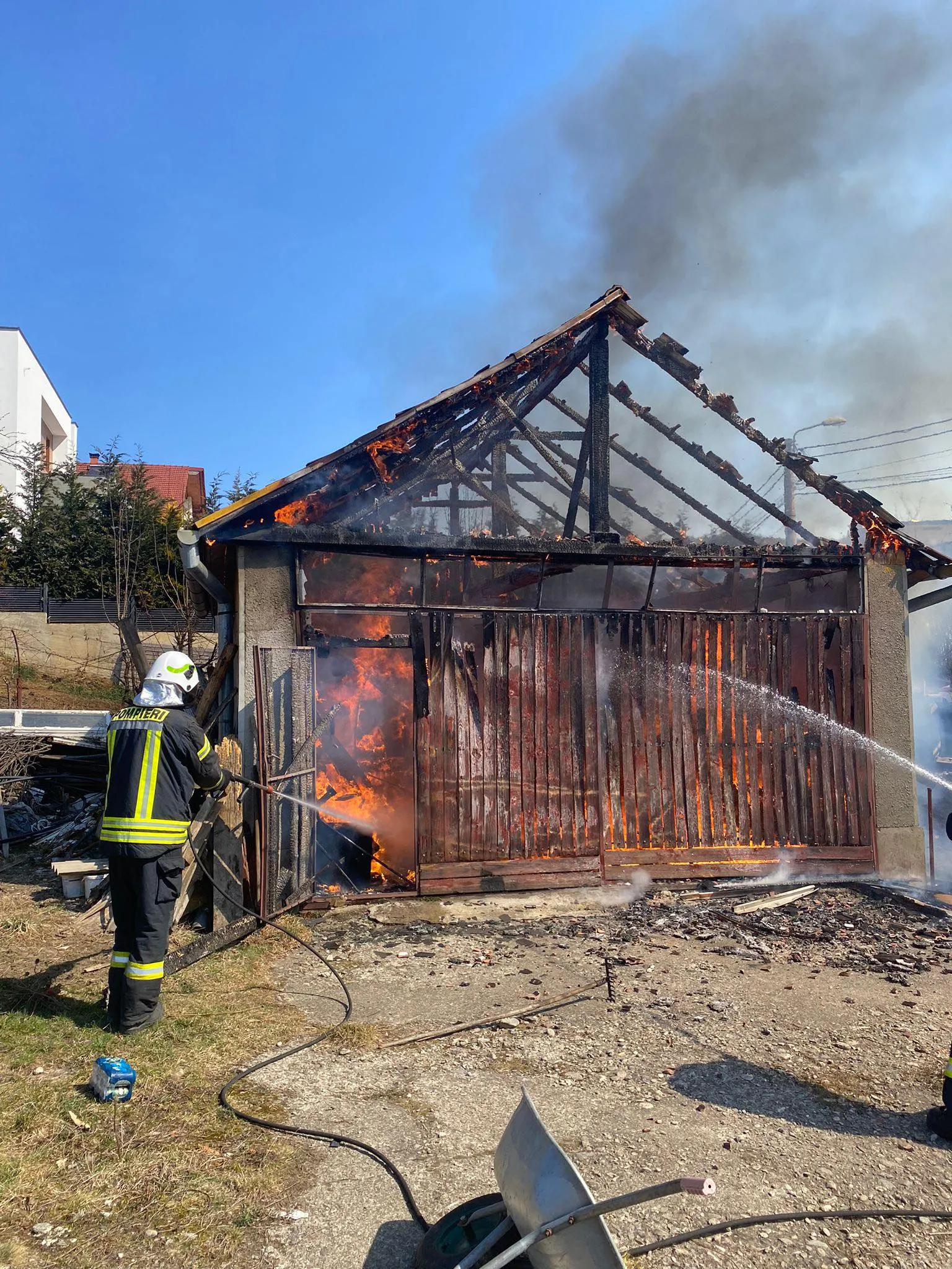 „Pompierii din cadrul Detașamentului 2 au intervenit la un incendiu care a afectat un garaj pe strada Liviu Rusu din Cluj-Napoca. Apelul de urgență a fost primit în jurul orei 14:15, iar pompierii s-au deplasat la fața locului cu două autospeciale. De asemenea, în sprijin a fost trimis și un echipaj de terapie intensivă mobilă. În momentul în care pompierii au ajuns la intervenție, flăcările ardeau generalizat atât la acoperișul garajului, cât și în interior. Acestea s-au propagat de la un incendiu de vegetație. Încercând să stingă focul, o femeie în vârstă de 80 de ani a suferit arsuri la nivelul membrelor superioare”, anunță ISU Cluj.