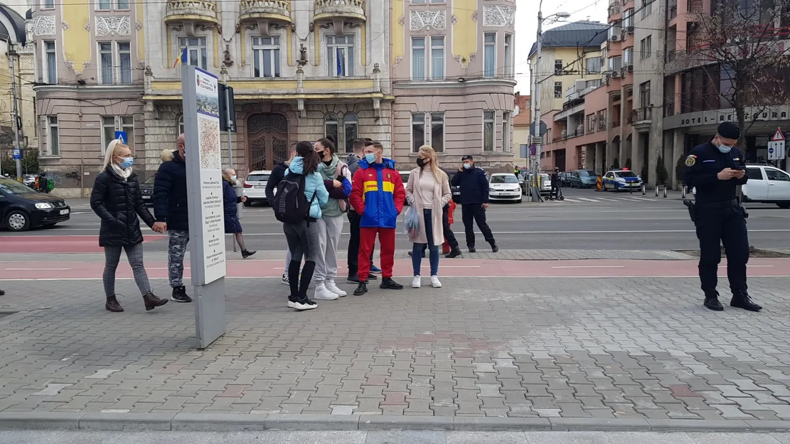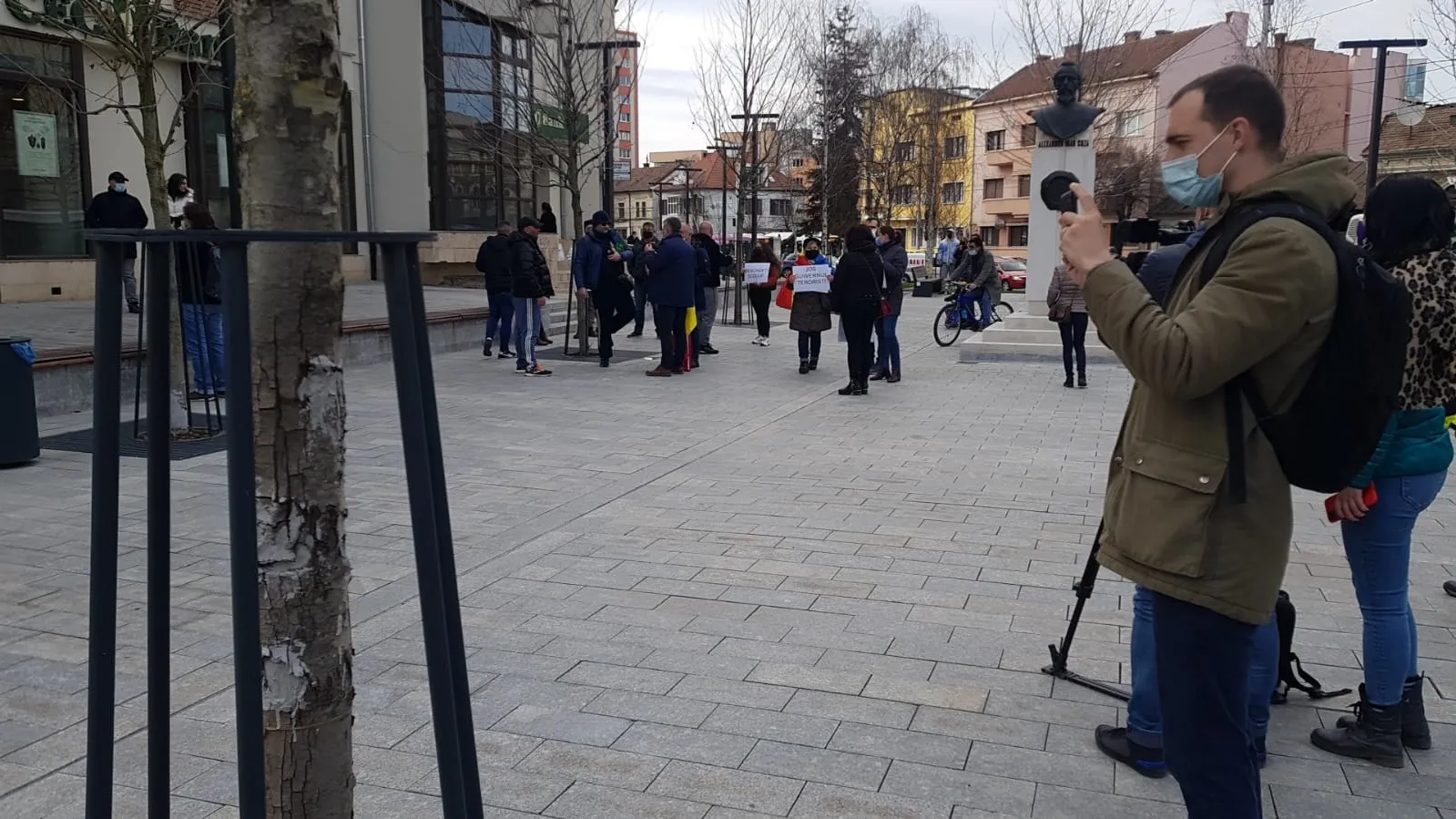 Protestul începe de la ora 18.00. Oamenii s-au strâns deja în piațeta din fața Prefecturii Cluj, unii dintre ei nu poartă mască.