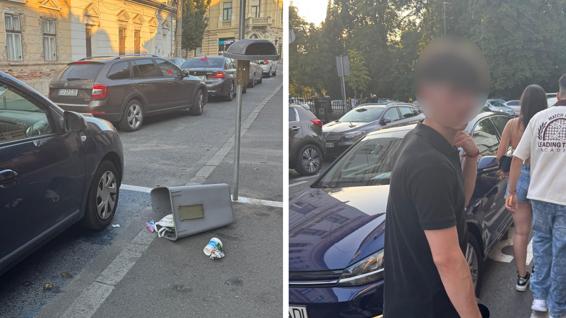 VIDEO Incident revoltător în Cluj-Napoca: Tânăr surprins în timp ce lovește o mașină cu un coș de gunoi: „Se crede ceva pui de șmecher”