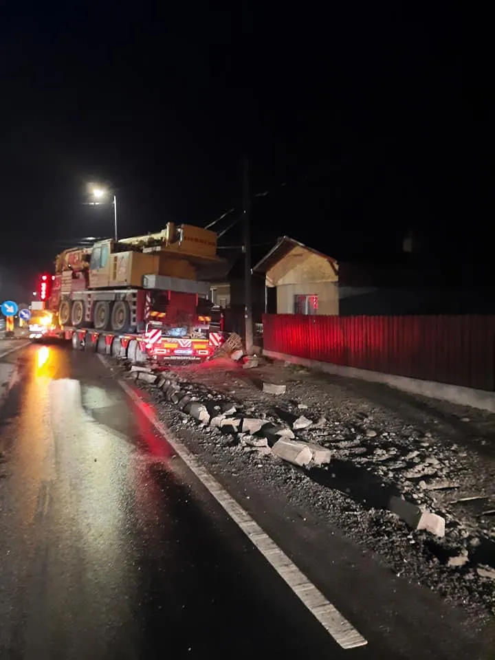 Incident rutier în Căpușu Mare! Un transport agabaritic a rămas blocat pe drum, cu roțile sparte - FOTO