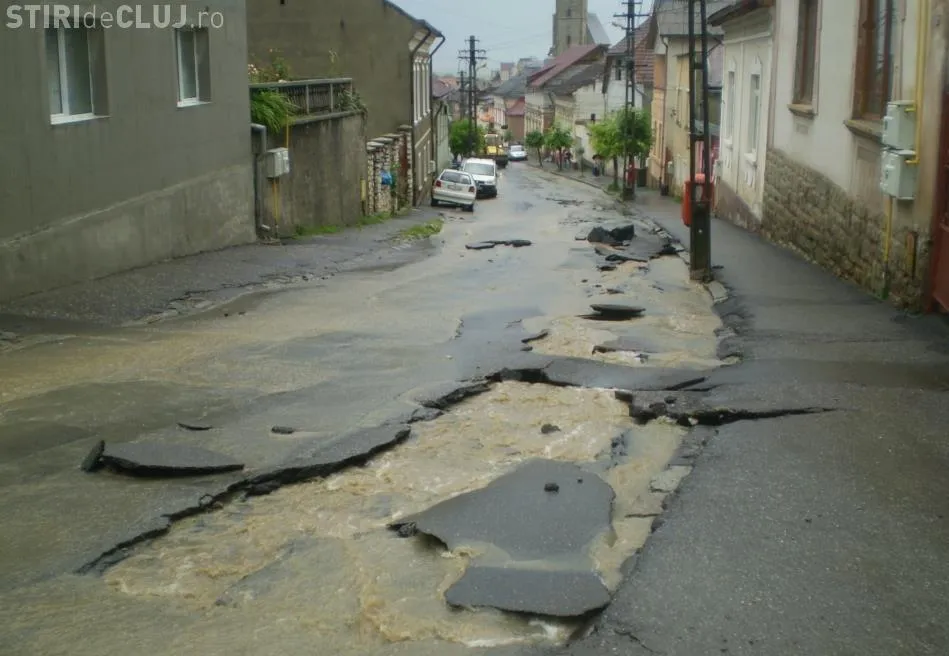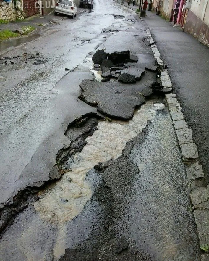 INCREDIBIL! Potopul de la Dej a spalat asfaltul de pe o strada FOTO