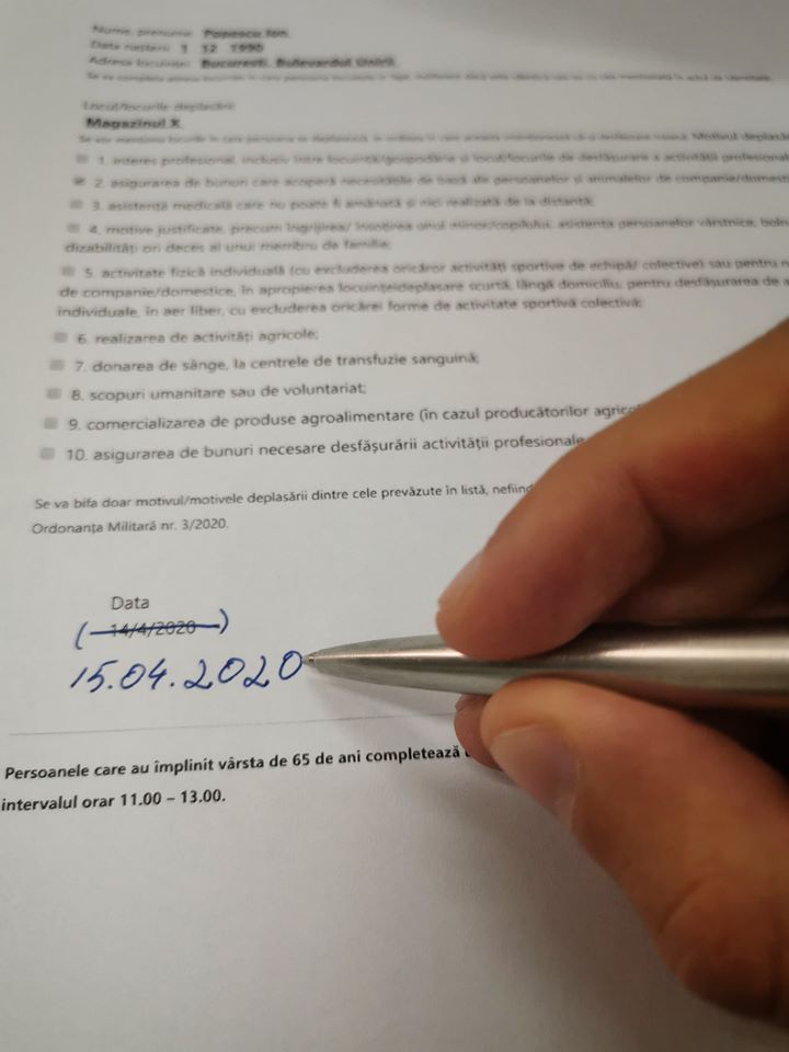 ”Întrebare: Având în vedere că din cauza restricțiilor este dificil să găsim foi pentru completarea declarațiilor pe proprie răspundere, mai ales pentru persoanele în vârstă sau din mediul rural, este permis să refolosim declarația prin modificare datei, în cazul deplasărilor pentru tratamente medicale frecvente sau pentru deplasări la magazinul din apropierea casei ori la farmacie? În funcție de posibilități, se poate tăia cu pixul sau cu pastă corectoare?