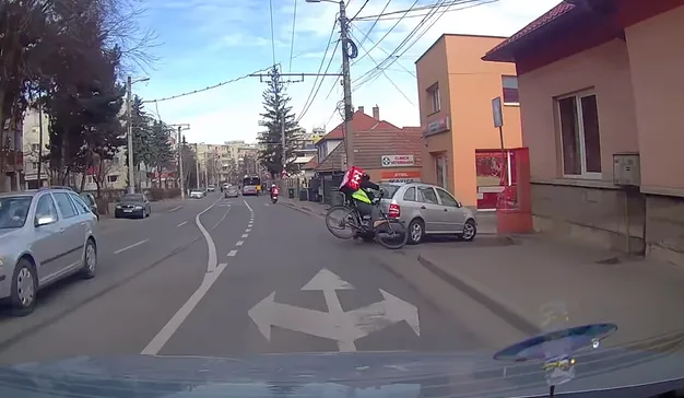 Un eveniment neplăcut a avut loc miercuri dimineața pe o stradă din Cluj-Napoca. Un livrator de mâncare pe bicicletă a intrat într-o mașină, după ce șoferul a virat la dreapta.
