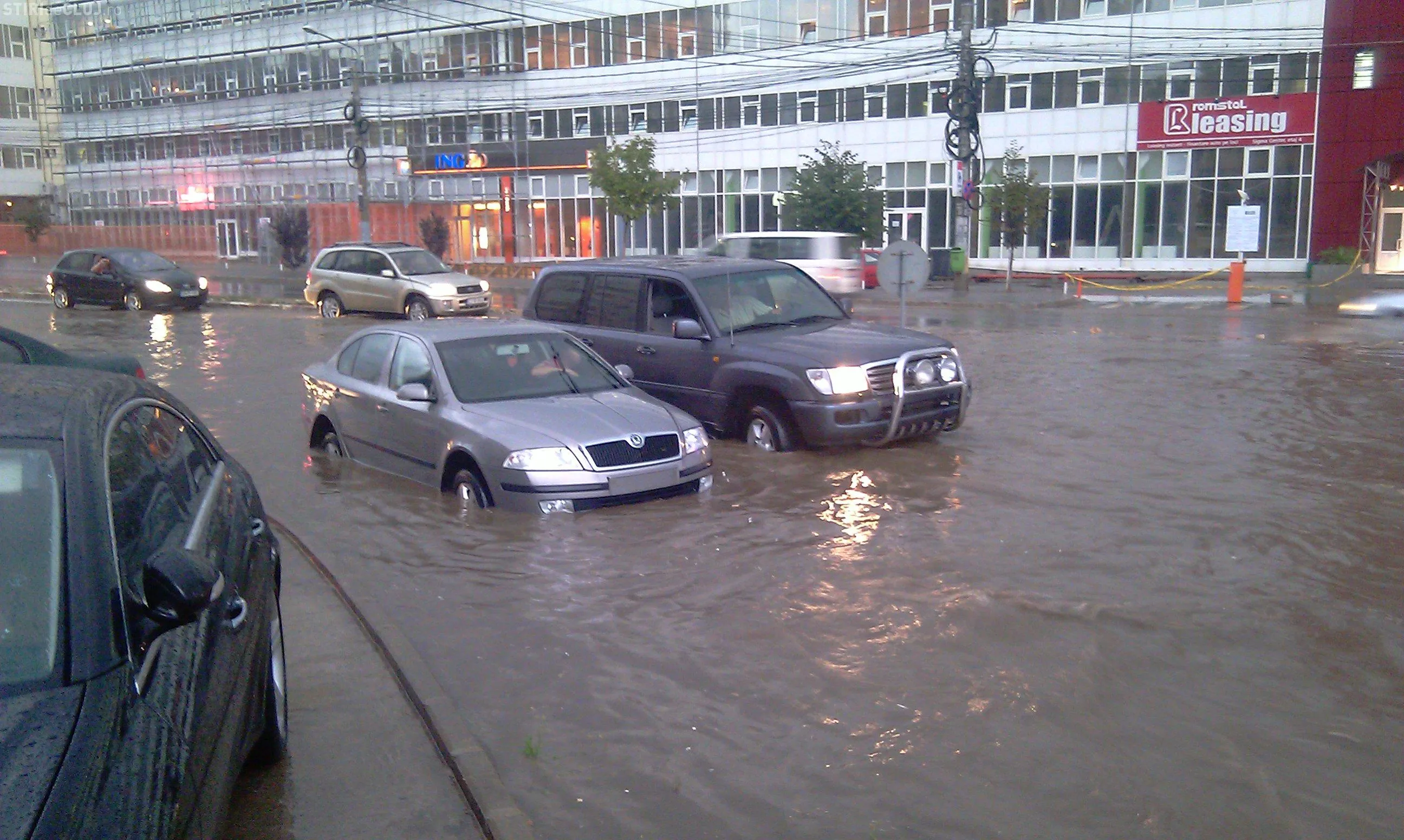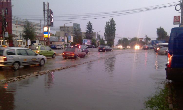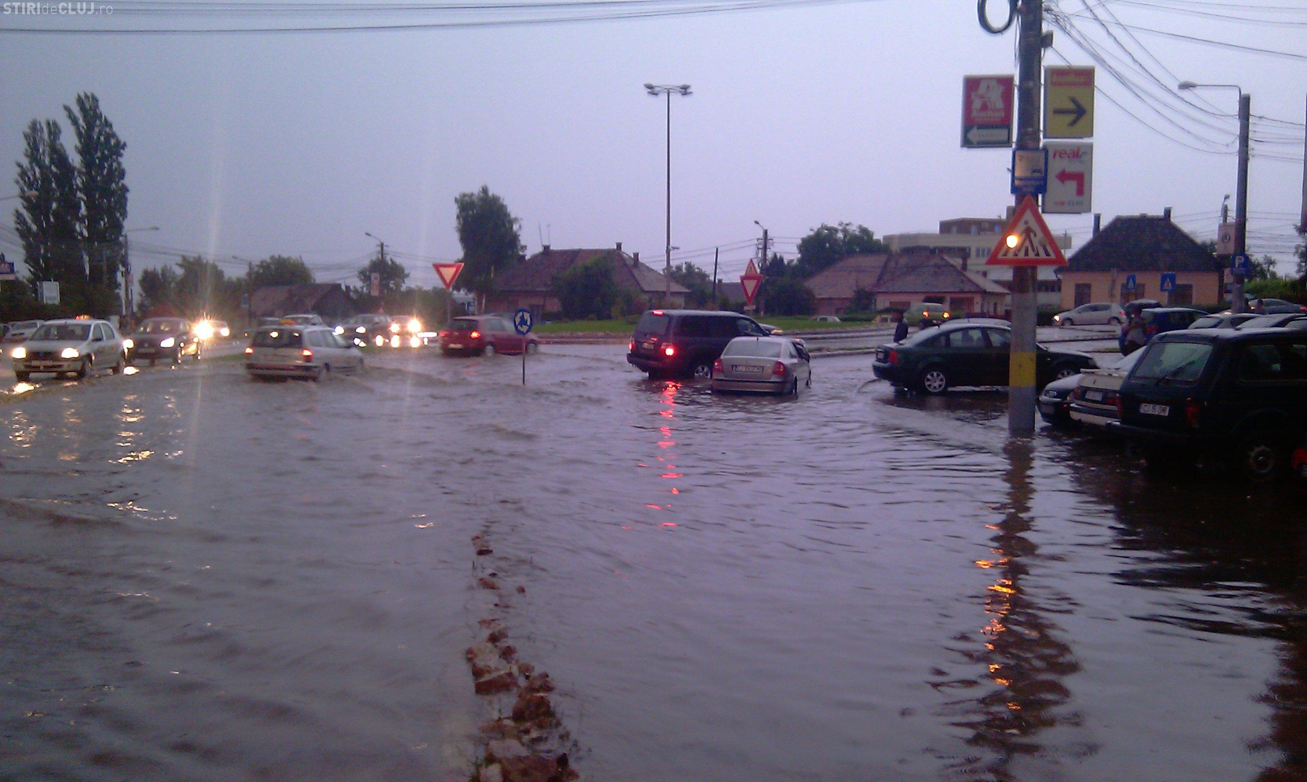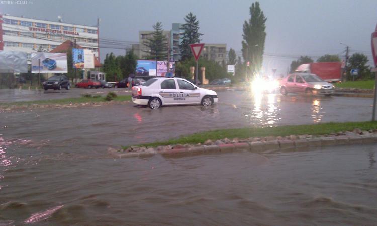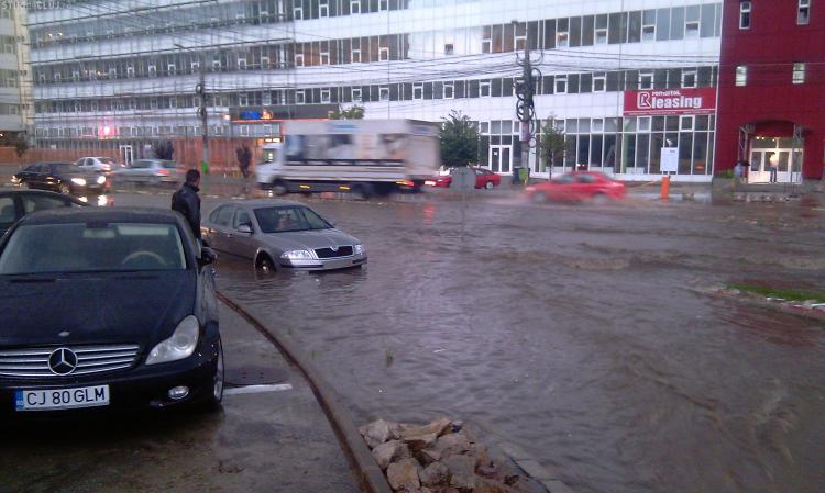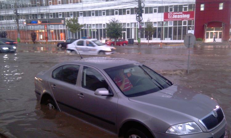 Strada Observator din cartierul Zorilor este inundata la intersectiile cu Meteor si Calea Turzii. Un autoturism Skoda a ramas in apa, care atinge pana la 50 de centimetri. Canalizarea nu a facut fata ploii.