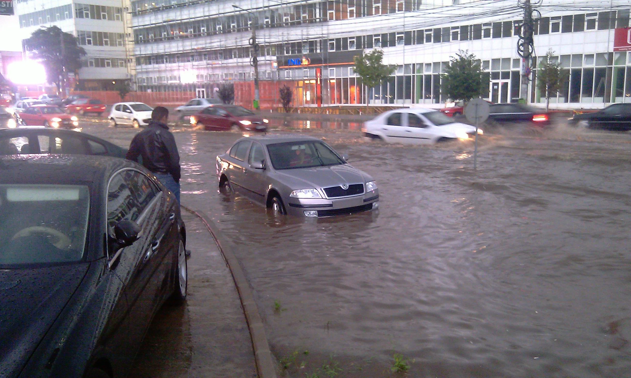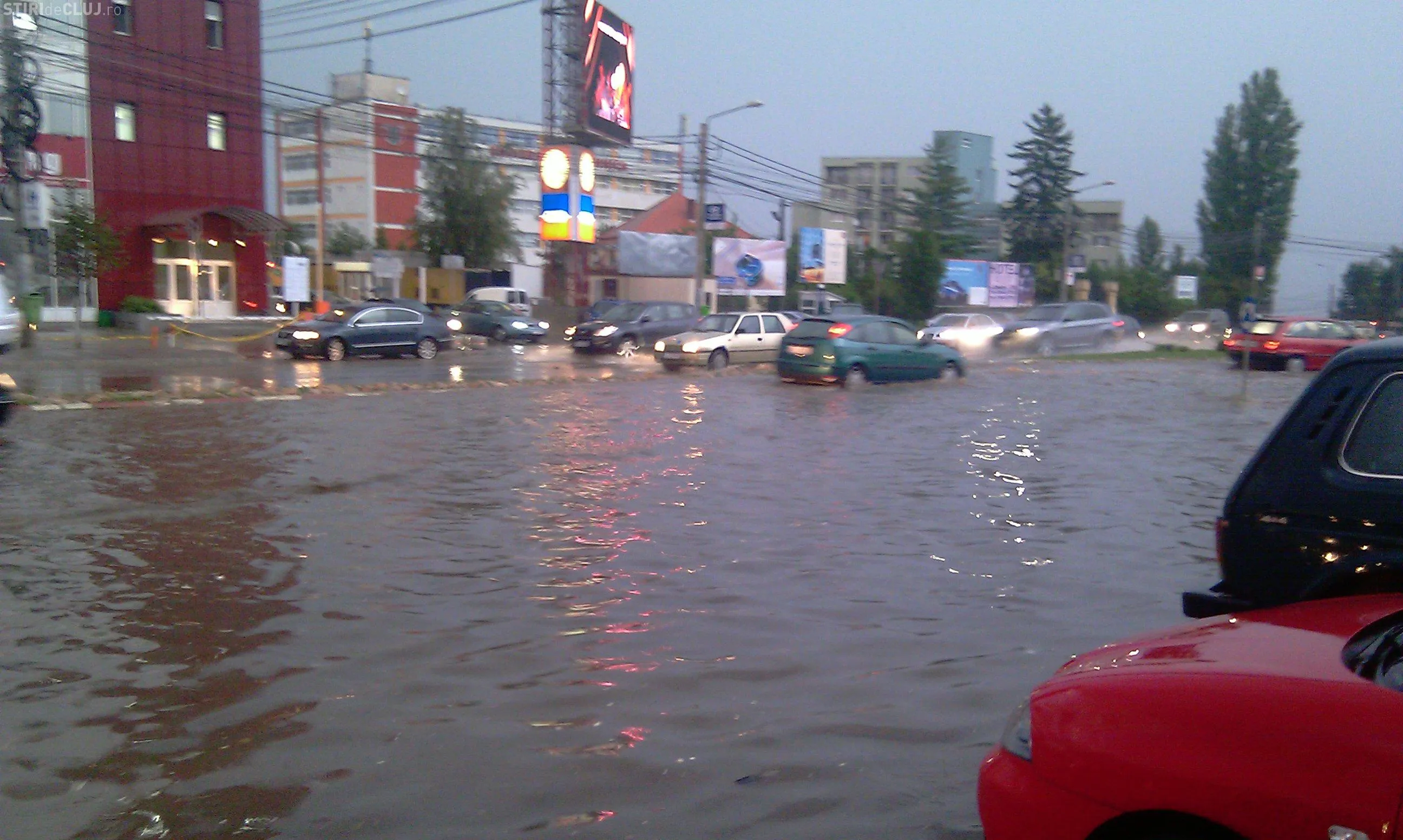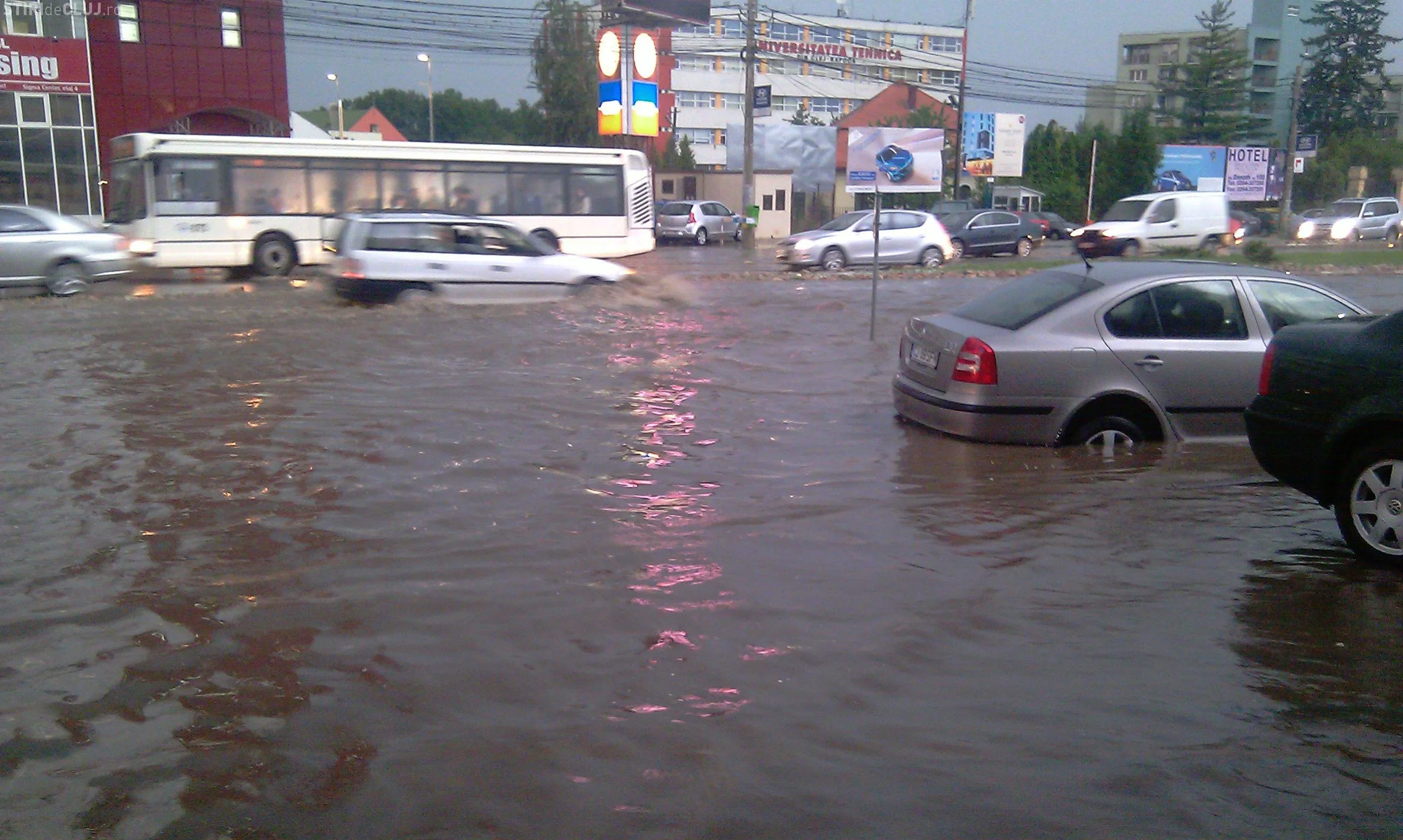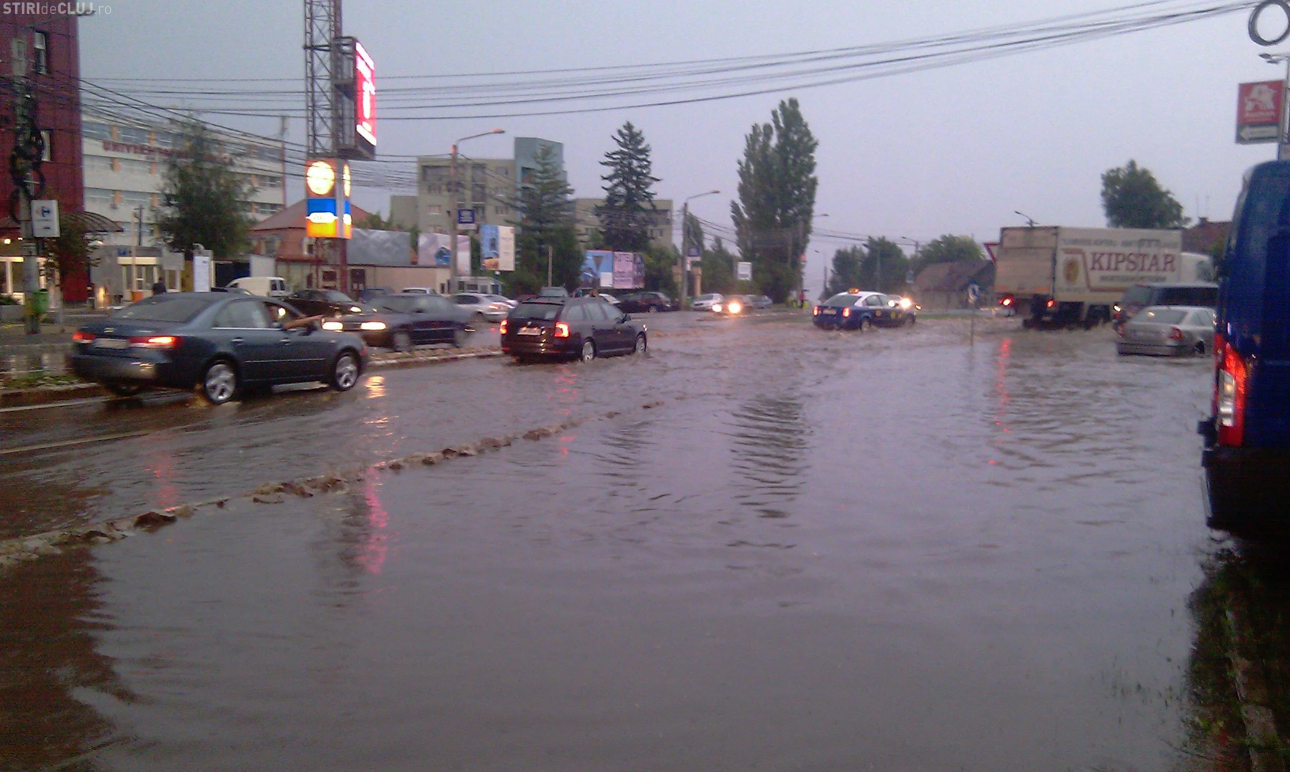 Strada Observator din cartierul Zorilor este inundata la intersectiile cu Meteor si Calea Turzii. Un autoturism Skoda a ramas in apa, care atinge pana la 50 de centimetri. Canalizarea nu a facut fata ploii.