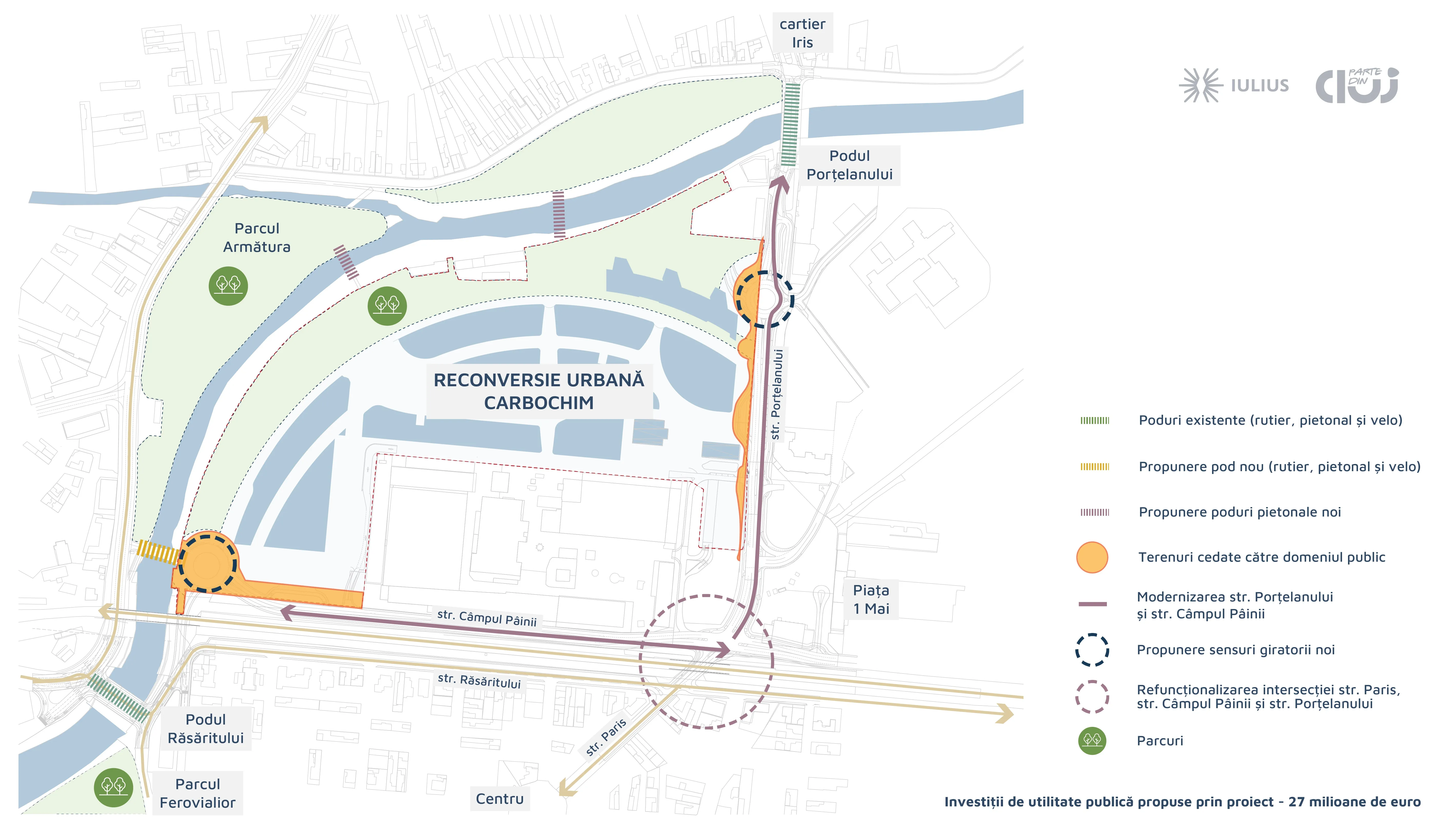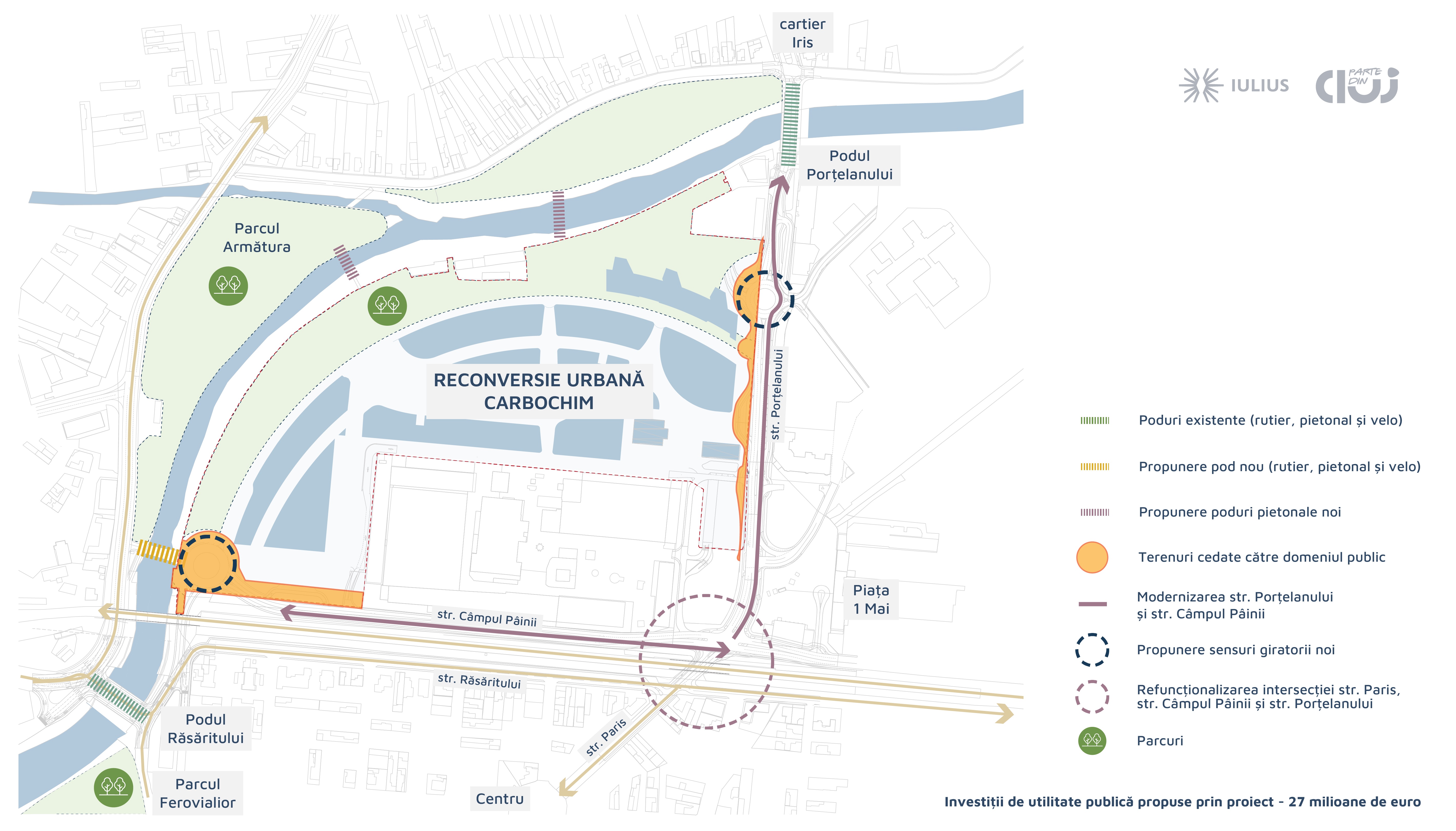 - amenajarea a două sensuri giratorii, pentru fluidizarea traficului din zona Podul Porțelanului și Parcul Feroviarilor;
