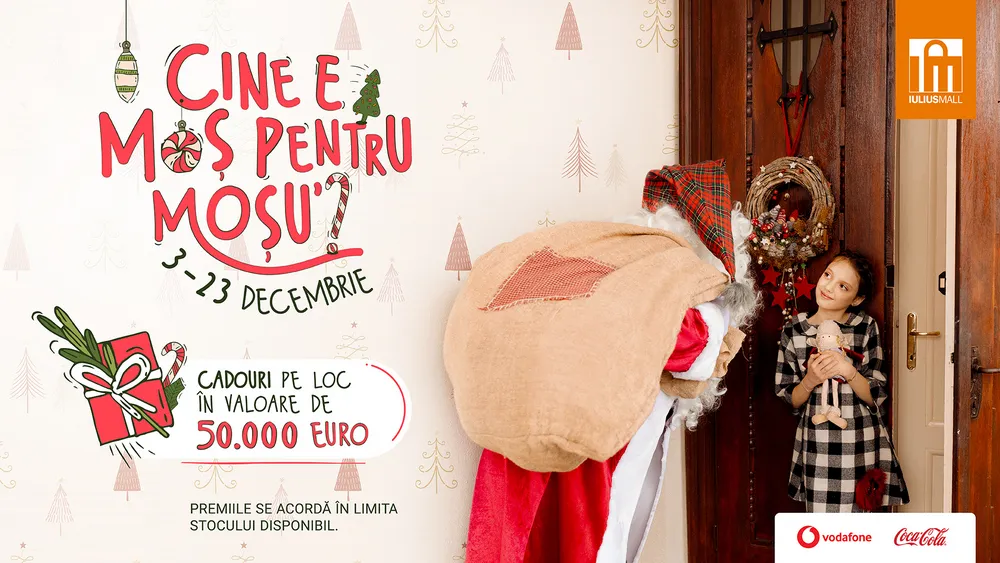 Iulius Mall Cluj este locul pe care trebuie să îl vizitezi pentru a deveni un mic spiriduș cu tolba plină de cadouri pentru cei dragi. Decorațiuni pentru casă, hăinuțe pufoase, bijuterii, articole de îmbrăcăminte și încălțăminte, posibilitățile sunt nenumărate, iar cadourile sunt garantate. Trebuie doar să faci două achiziții de minim 200 lei fiecare, de la două magazine diferite, iar mai apoi să te prezinți în aceeași zi, la Centrul de Premiere din Iulius Mall Cluj, poziționat în atriumul principal. Vodafone și Coca-Cola sunt printre ajutoarele de nădejde, care aduc magia sărbătorilor de iarnă.
