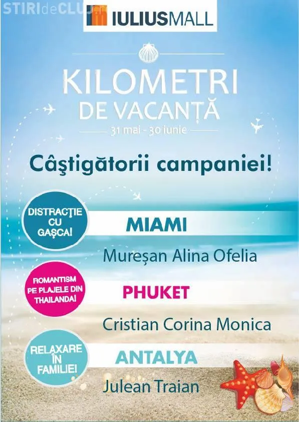 Iulius Mall Cluj şi-a desemnat câştigătorii campaniei „Kilometri de vacanţă”, desfăşurată în perioada 31 mai – 30 iunie 2013. Trei norocoşi pasionaţi de shopping îşi fac bagajele pentru a pleca în trei sejururi de răsfăţ, în cele mai râvnite destinaţii turistice.