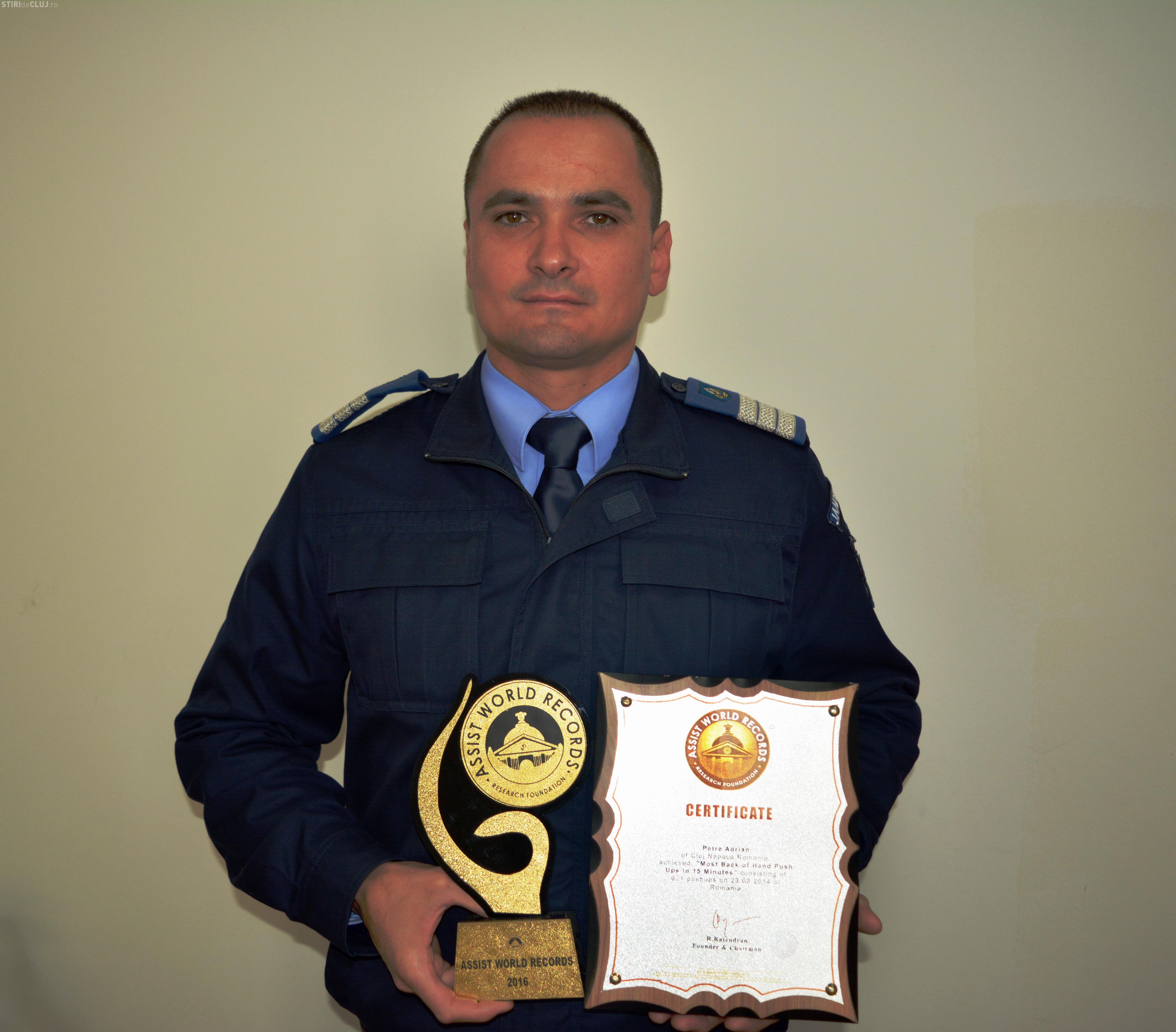 ”Recordul mondial la flotări pe dosul palmelor, înregistrat de jandarmul clujean Adrian PETRE în data de 16 martie 2014 (631 repetări în 15 minute) a fost omologat de către ASSIST WORLD RECORDS”, informează Inspectoratul Județean de Jandarmerie Cluj.