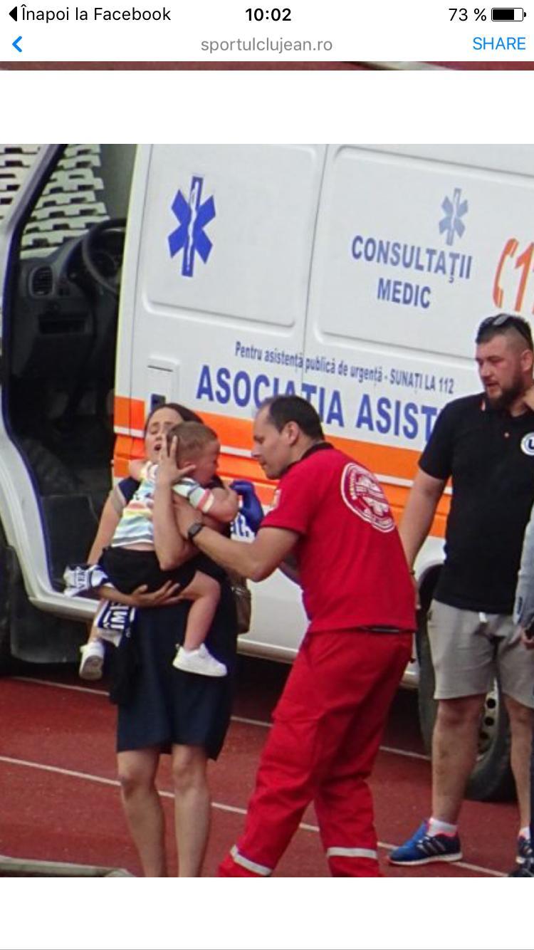 Familia Coste a coborât din peluza în care se aflau suporterii U Cluj, în momentul în care a izbucnit scandalul. Cristian Coste era cu soția însărcinată și cu fiul lor. ”Soția mea avea bilet la tribună, dar a venit în peluză pentru că era soare și cald. Când am văzut că suporterul a intrat în teren și au izbucnit altercații noi am plecat. Am coborât, iar soția s-a dus până la baie. Eu am rămas pe culoar alături de un prieten și aveam băiatul în brațe. Atunci au venit în fugă suporterii și după ei erau jandarmii. Când m-au văzut, direct mi-au dat cu lacrimogene în față, deși se vedea că am un copil în brațe. Am apucat să îi feresc fața. Nu am mai știut de mine. Nu mai vedeam nimic. Pe soția mea și pe copil i-a luat cineva și i-a dus în tribună. Când i-am găsit, ne-am dus la ambulanță pentru că mă ardea fața și mâinile.
