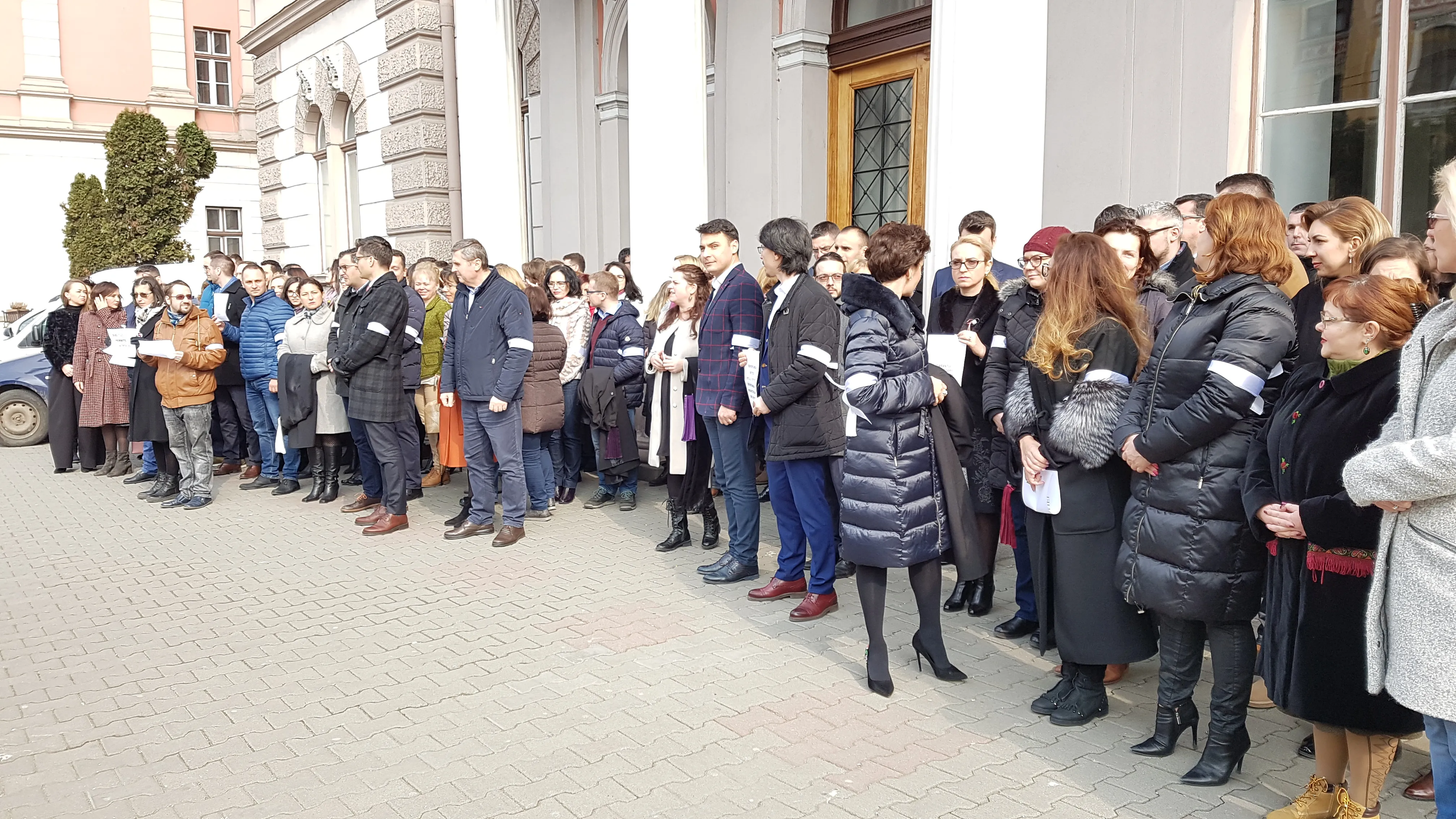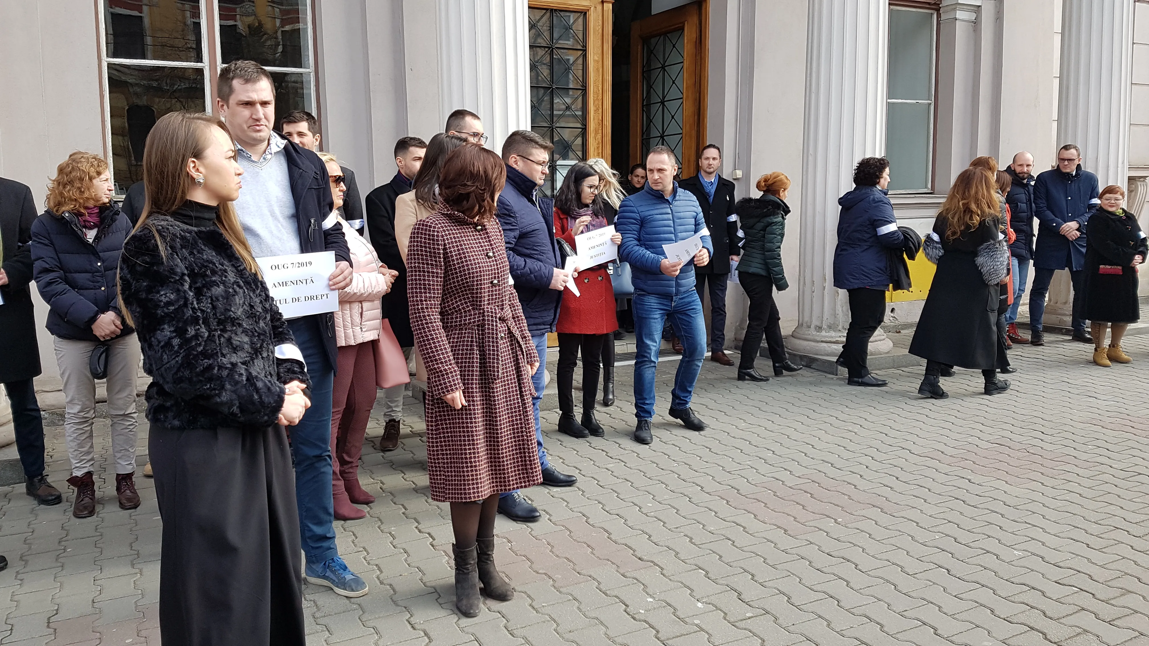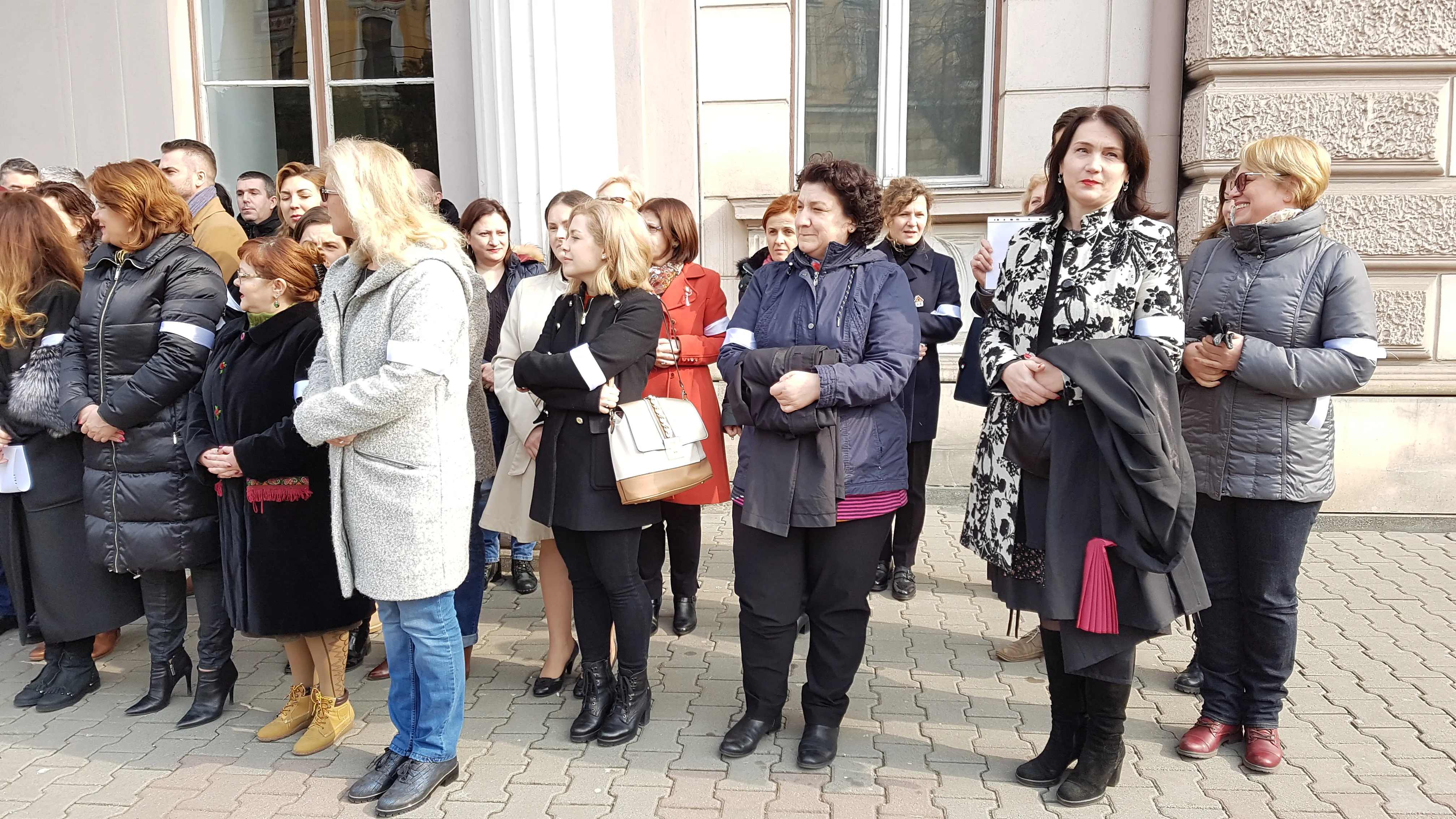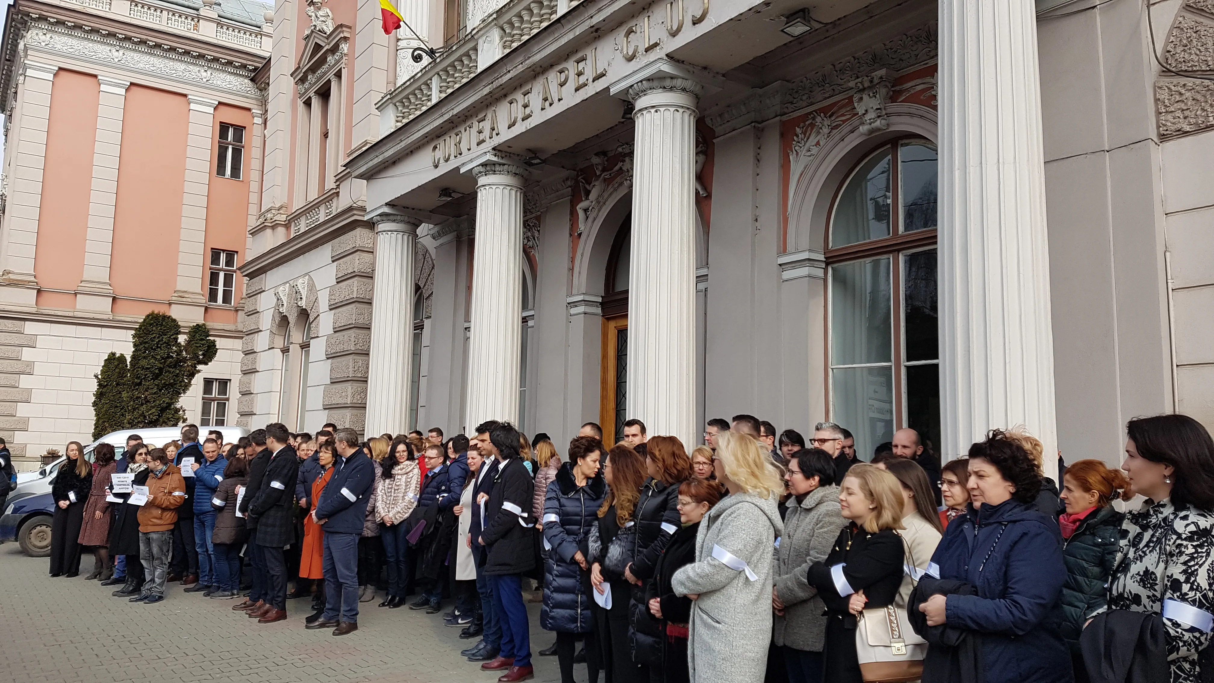 Judecatorii clujeni au iesit în fata Palatului de Justitie si vineri, 1 martie, pentru a protesta. Au participat circa 300 de judecatori si procurori din tot judetul.
