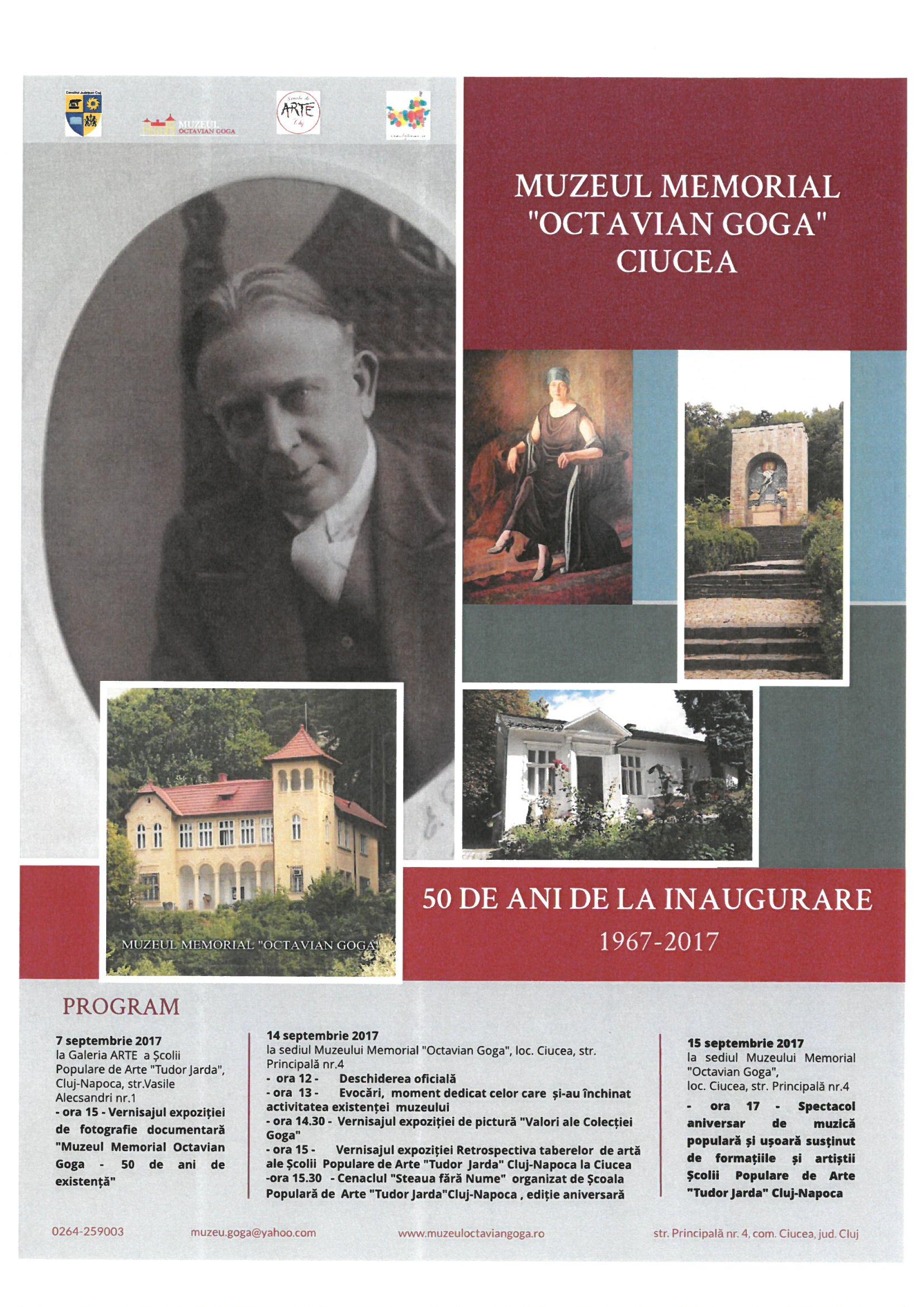 Astfel, joi, 7 septembrie, începând cu ora 15.00, la Galeria Arte din Cluj-Napoca, situată pe strada Vasile Alecsandri nr.1, va avea loc vernisajul expoziției de fotografie documentară ”Muzeul Memorial Octavian Goga - 50 de ani de existență”. Manifestările culturale dedicate semicentenarului vor continua în zilele de 14 și 15 septembrie a.c., acestea urmând a se desfășura la sediul Muzeului Memorial ”Octavian Goga” din localitatea Ciucea, str. Principală nr. 4.