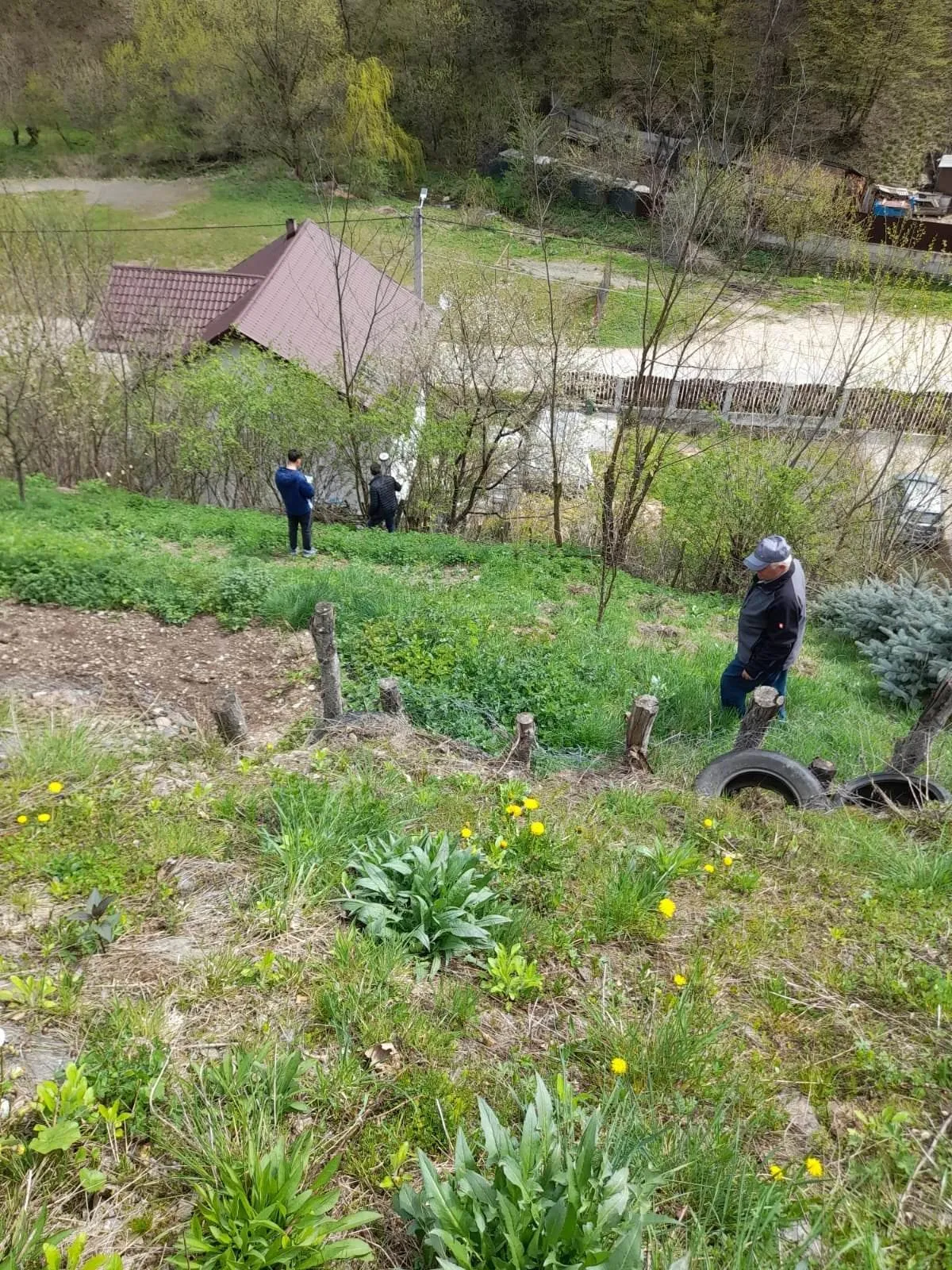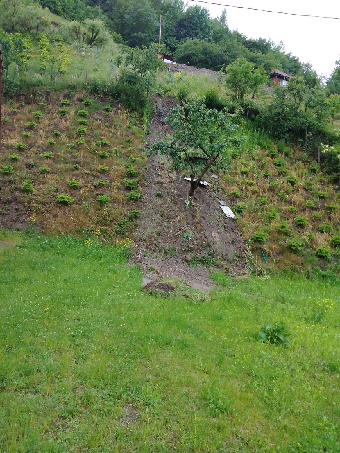 După ce a închis drumul la o lună si jumătate a venit o ploaie torențială și terenul fiind in pantă i-a inundat curtea. Vă trimit fotografia (foto mai jos). Crăpăturile la casă nu au legătură cu drumul care urcă la mine. Și-a ridicat un nicel la casă fără studiu geofizic”, a contra atacat Nicolae Handru, vecinul care nu mai are acces la casa lui, pentru că o parte din drum a dispărut.