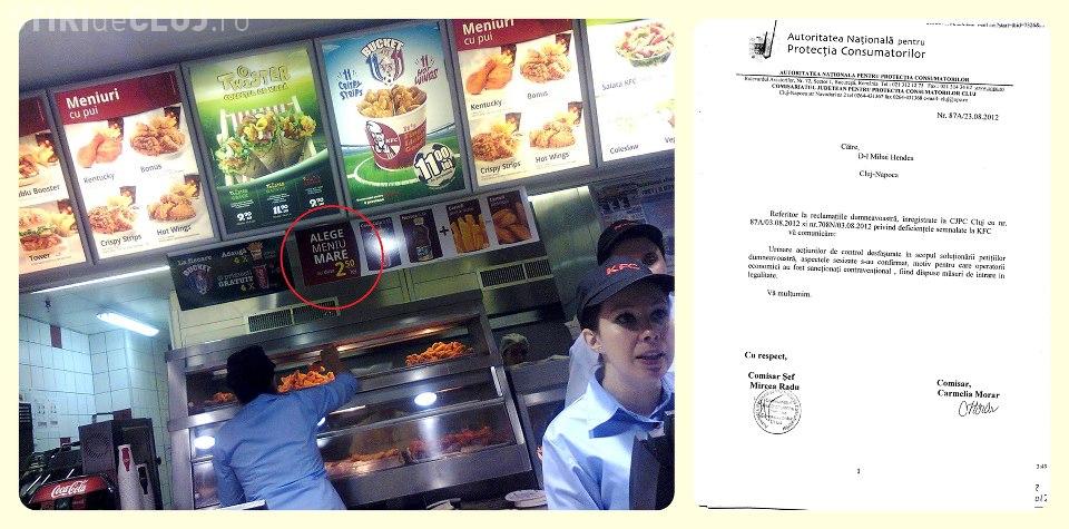 KFC - restaurantul cu servire rapidă cu produse din carne de pui preparate după Reţeta Originală a Colonelului Sanders a fost amendat de către inspectorii OPC Cluj pentru afişarea de reclamă mincinoasă.