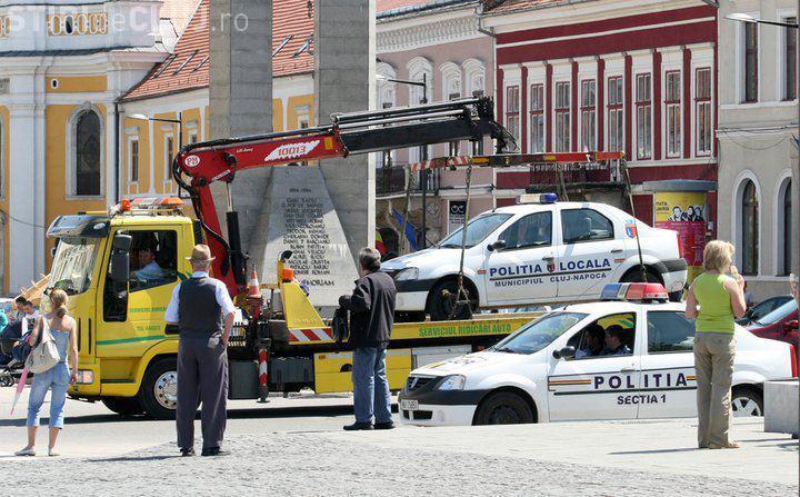 O mașină a poliției locale a fost ridicată din Piața Unirii, iar scena a fost fotografiată de un clujean și postată pe Facebook.