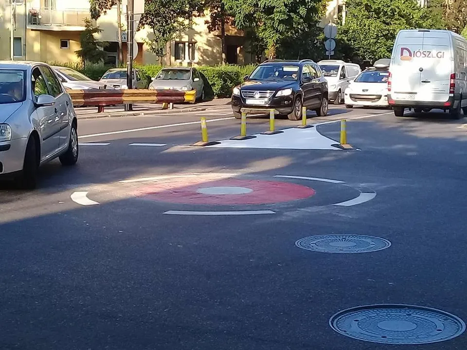 Stâlpișorii micului sens giratoriu din acel loc au dispărut, iar în locul lor a apărut sensul giratoriu desenat pe asfalt.