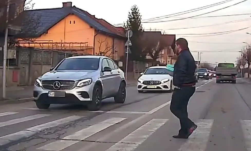 Un astfel de moment a avut loc pe o stradă din oraș, atunci când, un pieton care s-a angajat în traversarea străzii a fost nevoit, pur și simplu, să se oprească în mijlocul trecerii deoarece un șofer, care se afla la volanul unui Mercedes, nu a oprit pentru a-l lăsa pe om să treacă strada.
