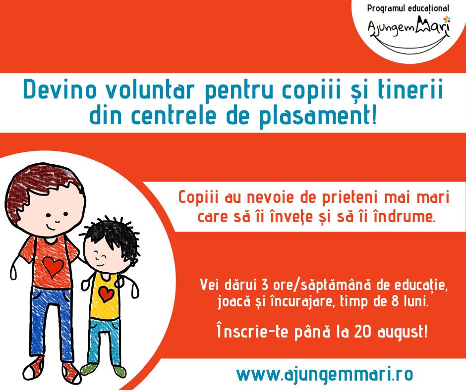 Copiii din centrele de plasament au nevoie de oameni calzi care să îi asculte, să îi învețe și să îi încurajeze permanent. Ei nu au familia aproape, iar personalul din centre este insuficient pentru a acoperi nevoile copiilor. Programul educațional Ajungem MARI caută voluntari pentru 2.200 de copii din București și 24 de județe, voluntari care să dedice copiilor 3 ore pe săptămână în următorul an școlar.