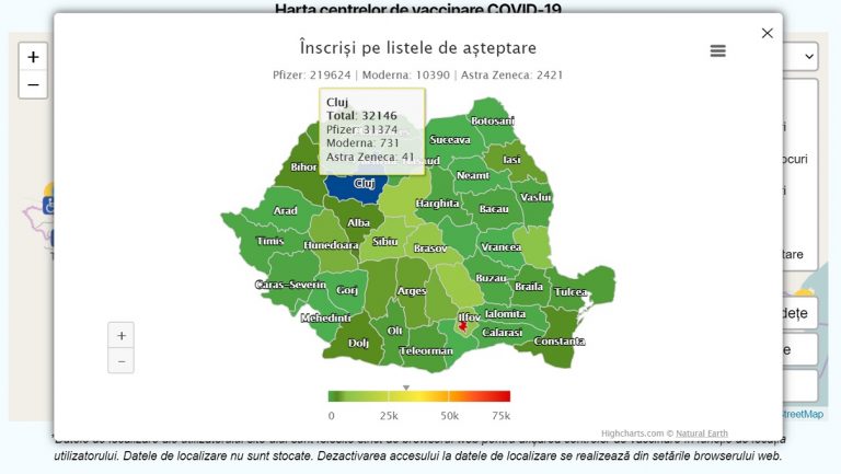 La Cluj, 32.146 de persoane sunt înscrise pe listele de așteptare, din care peste 31.000 pentru Pfizer și 4.818 de locuri libere exclusiv pentru AstraZeneca. În județul învecinat Mureș sunt 12.822 de persoane care așteaptă un loc pentru a se vaccina cu Pfizer și sunt disponibile 1.771 de locuri – 535 pentru Moderna și 1.236 pentru AstraZeneca.