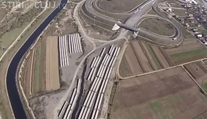 Pe imaginile surprinse de InterFlyRo se poate vedea cum, în zona Gilău, șantierul este avansat și au fost aduse traverse uriașe pentru amenajarea unui pod peste râul Someș.